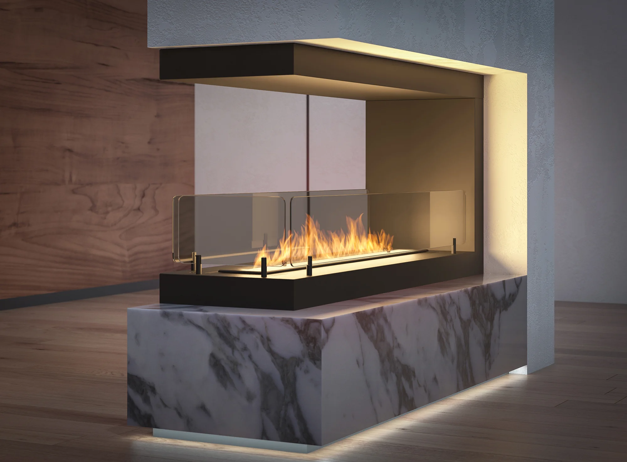 Konstrukcja w kształcie litery „C” sprawia, że płomień jest widoczny z różnych stron. Biokominek do salonu można umieścić w ścianie, co pozwala zaoszczędzić miejsce. Przeszklona osłona zabezpiecza płomień i zwiększa komfort użytkowania.