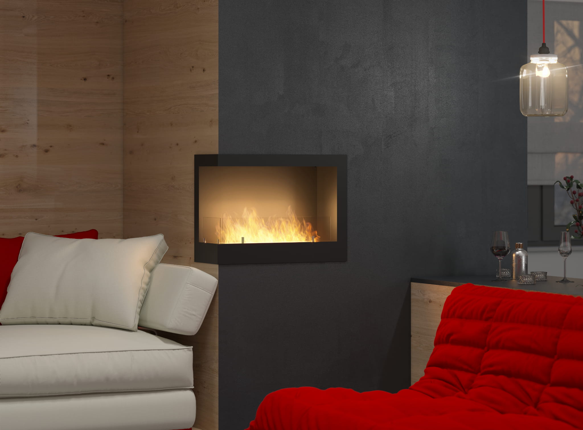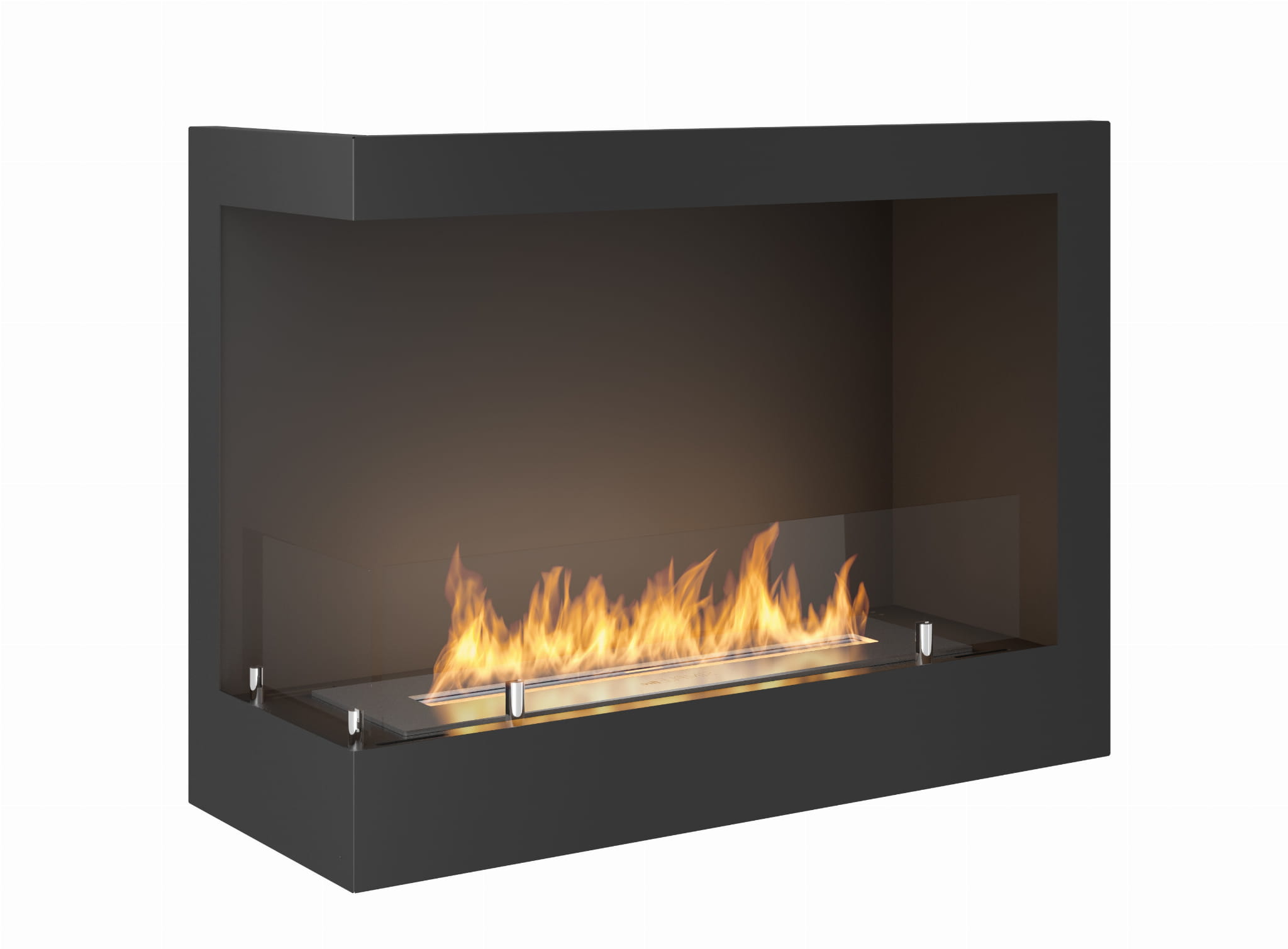 Dzięki narożnej konstrukcji biokominek na bioetanol sprawdzi się w salonie, sypialni lub biurze. Przeszklona osłona zabezpiecza płomień i zapewnia lepszą widoczność ognia, jednocześnie dodając nowoczesnego charakteru.