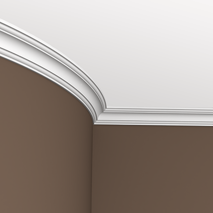 Profil smukły, z delikatnym wyobleniem w centralnej części oraz subtelnym przetłoczeniem przy górnej krawędzi. Front gładki, bez ornamentów, z czytelną, lekką linią przejścia między ścianą a sufitem. Model elastyczny przeznaczony do montażu na powierzchniach łukowych.