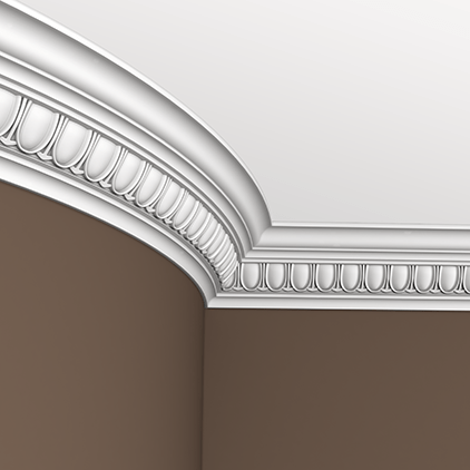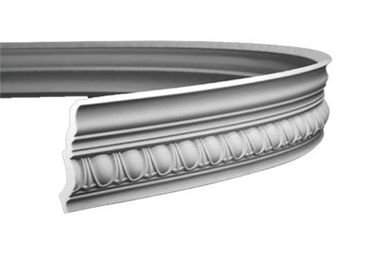 Profil z dekoracyjnym pasem w dolnej części frontu. Widoczny rytmiczny wzór owalnych elementów biegnie wzdłuż całej listwy, nad nim znajdują się poziome przetłoczenia zamykające kompozycję. Górna część delikatnie wyoblona, tworzy czytelne przejście między ścianą a sufitem. Model elastyczny przeznaczony do dużych łuków.