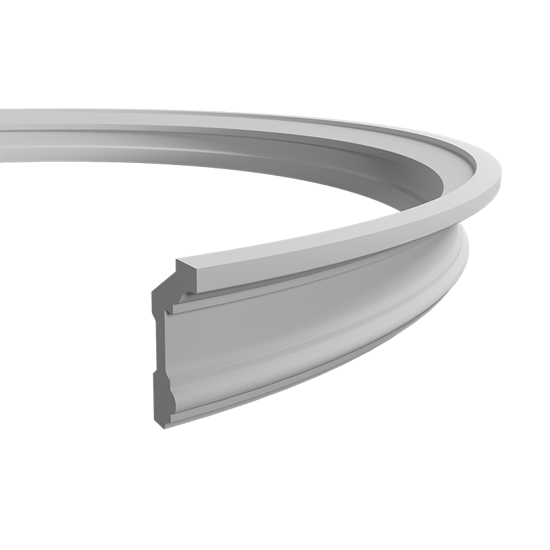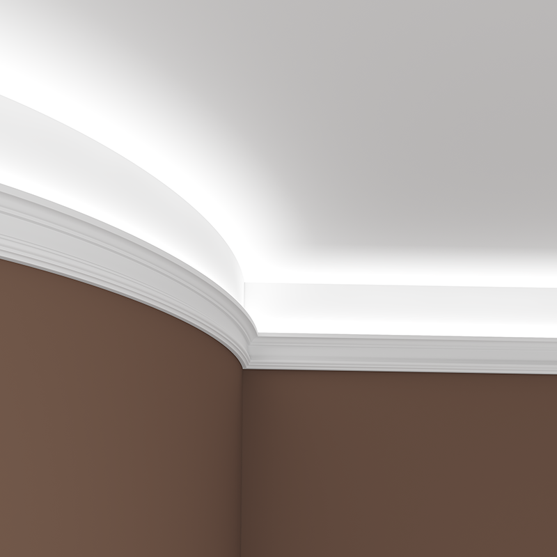 Listwa Gaudi LED o wydłużonej, lekko wyoblonej linii z delikatnym przetłoczeniem w dolnej części. Górna krawędź prosta, front bez ornamentów, z wyraźnym podcięciem od strony ściany. Forma uporządkowana, przeznaczona do estetycznego zamknięcia styku ściany z sufitem. Model elastyczny do małych promieni.