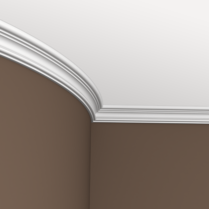 Profil smukły, z delikatnym wyobleniem w centralnej części i subtelnym przetłoczeniem przy dolnej krawędzi. Front gładki, bez ornamentów, z lekkim podcięciem od strony ściany. Forma prosta, przeznaczona do estetycznego wykończenia styku ściany z sufitem. Model elastyczny do powierzchni łukowych.