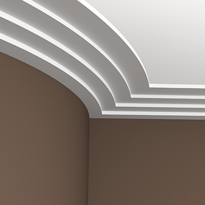 Ta listwa dekoracyjna sufitowa pozwala stworzyć szeroką opaskę przy suficie i estetycznie wykończyć połączenie ściany z sufitem także w pomieszczeniach z delikatnym łukiem.