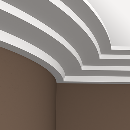 To rozwiązanie do przestronnych wnętrz z wysokim stropem. Wersja elastyczna umożliwia dopasowanie do łuków o bardzo dużym promieniu, dzięki czemu profil zachowuje ciągłość także na zaokrąglonych ścianach. W kolekcji Gaudi takie elementy stosowane są w projektach, gdzie potrzebny jest mocny akcent przy suficie.