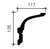 Profil rozbudowany, z wyraźnymi przetłoczeniami i kilkoma poziomami łuków. Front ma głębokie podcięcia i stopniowanie, dzięki czemu gzyms tworzy mocny detal przy suficie. Model elastyczny, przeznaczony do montażu na powierzchniach łukowych o różnym promieniu.