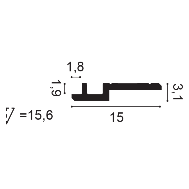 Profil o wyraźnie wertykalnym charakterze z ostrym, skośnym przejściem i prostą dolną krawędzią. Kompozycja symetryczna, bez zdobień, oparta na czystych liniach i geometrycznej formie. Przy wysokości 155 mm i szerokości 31 mm listwa mocno akcentuje górną część ściany, zachowując wąski kontakt z sufitem. Sprawdzi się w wysokich pomieszczeniach, na klatce schodowej, w nowoczesnym holu oraz w przestrzeniach komercyjnych o minimalistycznym charakterze.