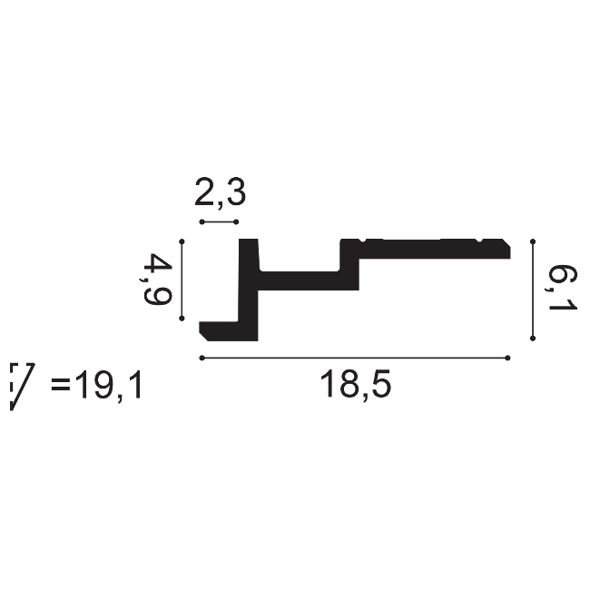 Model o wyraźnym, klasycznym profilu z mocno zaznaczonym podcięciem i szeroką płaszczyzną przejścia między ścianą a sufitem. Przekrój buduje głęboki cień i optycznie porządkuje styk obu powierzchni. Wysokość 185 mm sprawia, że element jest dobrze widoczny nawet w większych pomieszczeniach.
