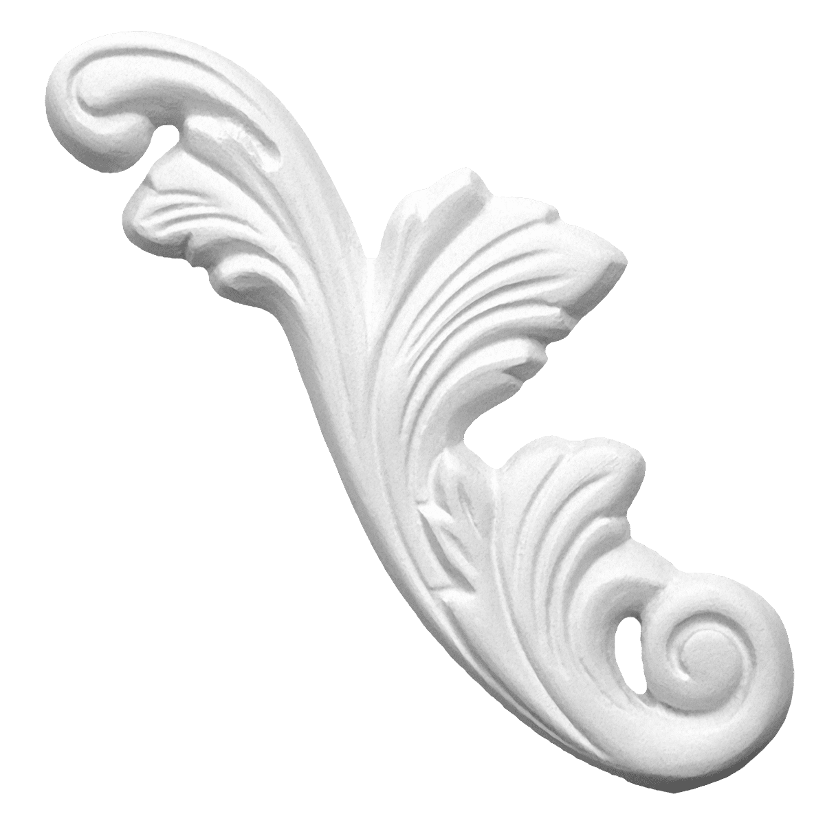 Smukły, pionowy ornament o dynamicznej linii z wyraźnym motywem liściowym i spiralnym zakończeniem. Forma 67 × 165 mm pozwala zastosować element jako boczny akcent przy frontonie, w obudowie kominka lub jako detal pomiędzy pilastrami. Wydłużony kształt podkreśla pion kompozycji i wzmacnia architektoniczny charakter aranżacji.