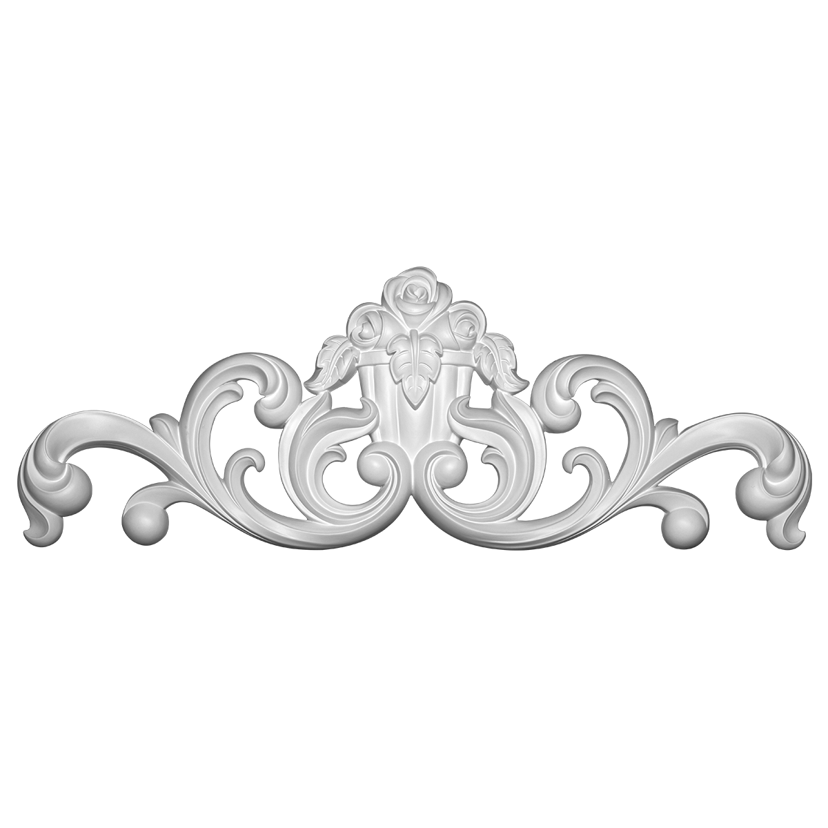Duży, symetryczny ornament o bogatej kompozycji roślinnej z wyraźnym rytmem i centralnym podziałem. Szerokość 895 mm oraz wysokość 318 mm sprawiają, że element przeznaczony jest do reprezentacyjnych aranżacji – nad portal kominkowy, jako zwieńczenie frontonu lub główny akcent w klasycznej kompozycji ściennej. Grubość 50 mm zapewnia mocny efekt przestrzenny i podkreśla trójwymiarowy charakter detalu.