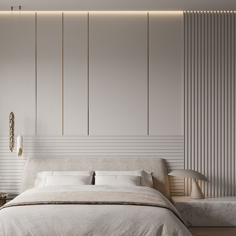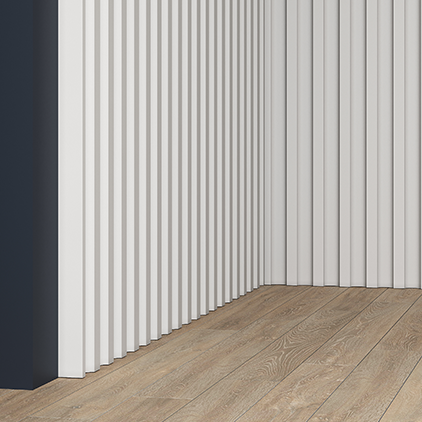 Biała powierzchnia eksponuje liniowy charakter profilu i ostrość krawędzi. Materiał zachowuje stabilność wymiarową i nie ulega zmianom pod wpływem wilgoci. Panel może być malowany, co pozwala zmienić kolor przy zachowaniu tej samej geometrii.