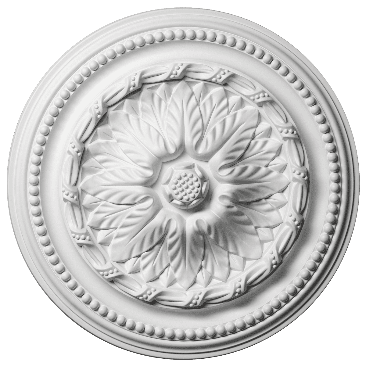 Rozeta o klasycznym, ornamentalnym układzie z wyraźnym motywem roślinnym w centralnej części. Środek wypełniony spiralnym wzorem, otoczony kilkoma pierścieniami z liściastymi i falistymi zdobieniami. Zewnętrzna krawędź wykończona szerokim, profilowanym obramowaniem. Forma wielowarstwowa, z wyraźnym reliefem.