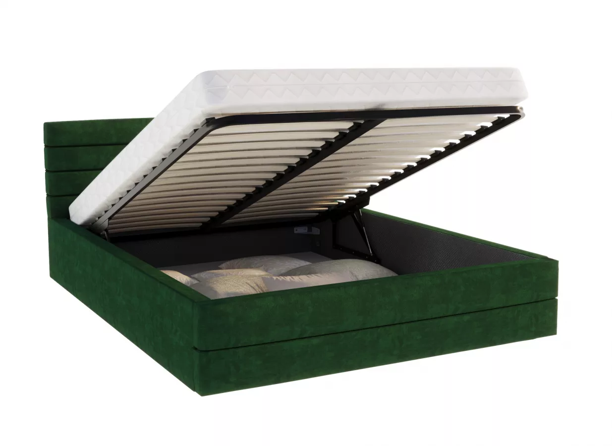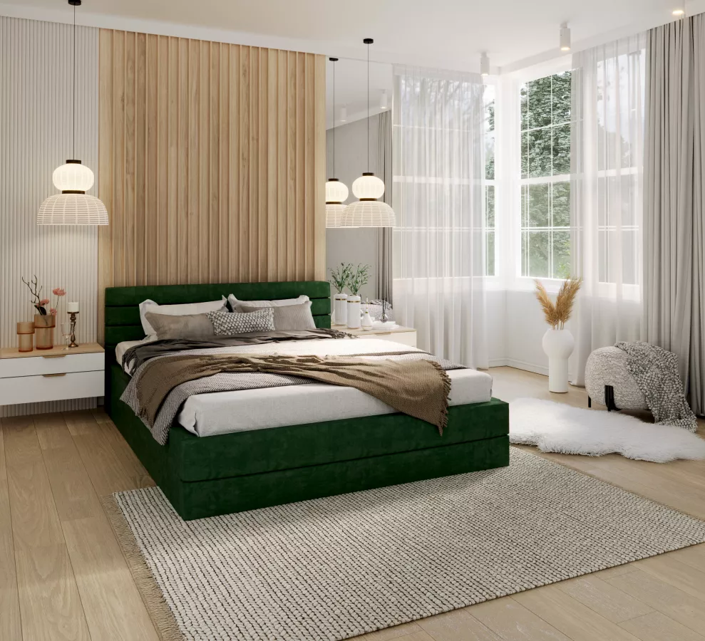 Decydując się na łóżko VIRGINIA TRINITY, inwestujesz w jakość snu, która przekłada się na codzienną energię i samopoczucie. Butelkowa zieleń wprowadzi do Twojego wnętrza harmonię, a tapicerka sprawi, że każda chwila spędzona w sypialni będzie prawdziwą przyjemnością. Solidna konstrukcja oraz elegancki design rozwiązują problem braku miejsca na przechowywanie, a także podnoszą estetykę całej przestrzeni. Zainwestuj w swój komfort i stwórz przytulny azyl, w którym będziesz mógł w pełni zrelaksować się po ciężkim dniu.