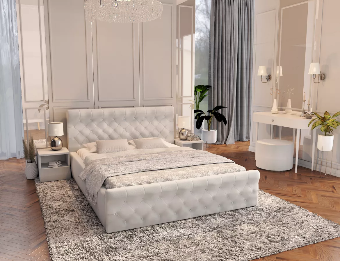 Łóżko tapicerowane CHICAGO - Paris to połączenie nowoczesnego designu z niezwykłym komfortem. Wykonane z wysokiej jakości materiałów, ten model wyróżnia się eleganckim pikowaniem i subtelnymi detalami, które nadadzą każdemu wnętrzu szlachetnego charakteru. Z jego wymiarami idealnie wpasuje się w różnorodne aranżacje sypialni, stanowiąc praktyczny element wystroju oraz zachwycający punkt centralny. Materiał tapicerski jest nie tylko estetyczny, ale również łatwy w czyszczeniu, co czyni utrzymanie go w doskonałym stanie prostym i wygodnym.