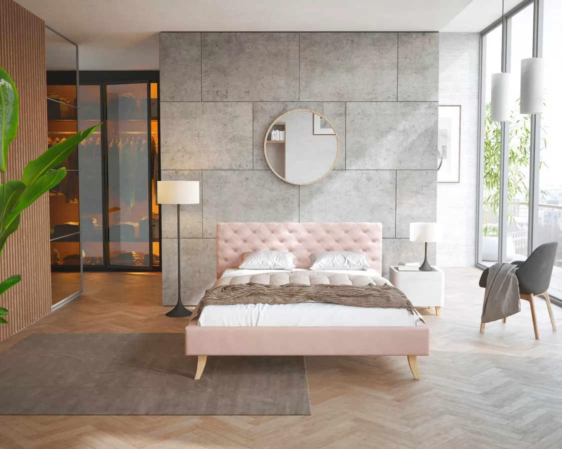 Łóżko tapicerowane KALIFORNIA- TRINITY w kolorze jasnego różu o wymiarach 140 x 200 cm to doskonały wybór dla wszystkich, którzy pragną stworzyć w swojej sypialni przytulną i estetyczną przestrzeń. Jego ponadczasowy design łączy nowoczesność z klasycznym stylem, a atrakcyjne wykończenie dodaje mu wyjątkowego charakteru. Dzięki solidnej konstrukcji można liczyć na trwałość i wygodę użytkowania przez wiele lat. Każda noc spędzona na tym łóżku to gwarancja komfortu i wypoczynku, co sprawia, że staje się ono sercem każdej sypialni.