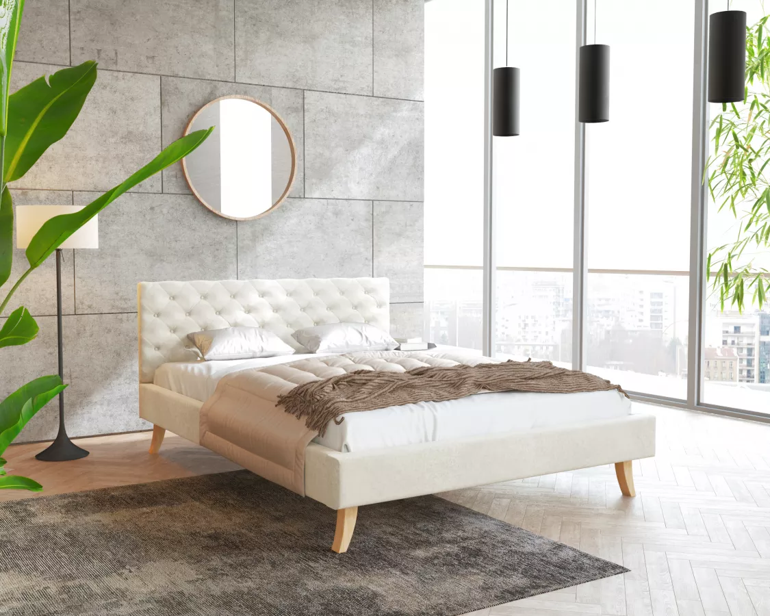 Łóżko tapicerowane KALIFORNIA- TRINITY w kremowym kolorze to synonim stylu i komfortu w Twojej sypialni. Z wymiarami 180 x 200 cm, zapewnia przestrzeń do wypoczynku, która przyciąga wzrok i zachęca do relaksu. Jego ponadczasowy design doskonale wpisuje się w różnorodne aranżacje wnętrz, a staranne wykończenie tworzy elegancką atmosferę. Przyjemne w dotyku materiały tapicerskie nie tylko dodają uroku, ale również gwarantują wygodę podczas snu. Dzięki solidnej konstrukcji, łóżko KALIFORNIA- TRINITY jest nie tylko estetyczne, ale także funkcjonalne, co czyni je doskonałym wyborem do każdej sypialni.