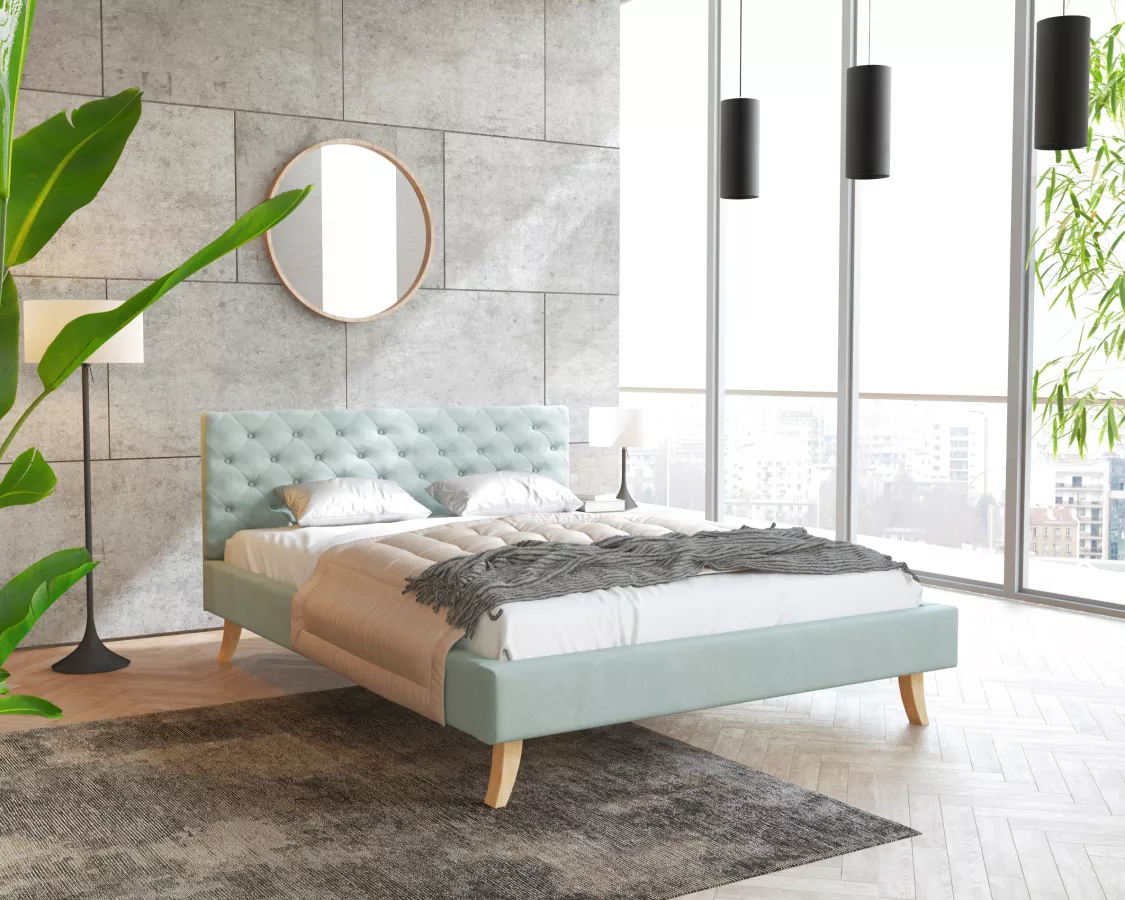 Łóżko tapicerowane KALIFORNIA- TRINITY w kolorze miętowym to doskonały wybór dla tych, którzy pragną połączyć estetykę z wygodą. Jego wymiary 120 x 200 cm idealnie komponują się w każdej sypialni, czyniąc ją przytulnym i stylowym miejscem odpoczynku. Dzięki ponadczasowemu designowi, KALIFORNIA- TRINITY nie tylko zachwyca, ale także wprowadza do wnętrza harmonię i elegancję. Wysokiej jakości tapicerka oraz staranne wykończenie sprawiają, że łóżko emanuje luksusem i funkcjonalnością, a każda noc spędzona na nim to prawdziwa przyjemność. To wyjątkowe mebel nie tylko pięknie wygląda, ale jest też niezwykle praktyczne, zapewniając komfort i wsparcie w trakcie snu.