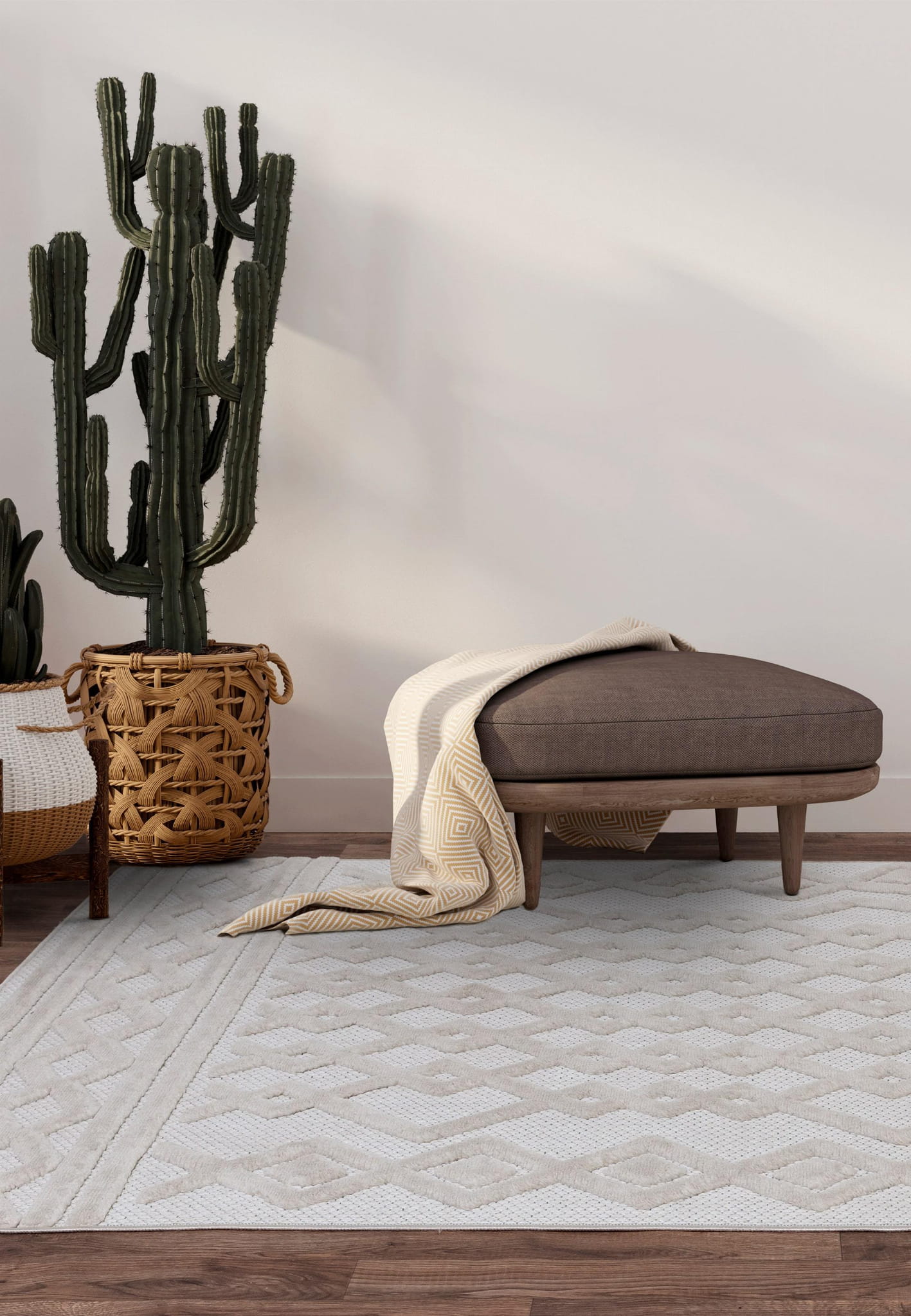 Główny kolor dywanu to biały, który idealnie komponuje się z różnorodnymi aranżacjami. Geometryczne wzory w odcieniach beżu nadają dywanowi nowoczesny i stylowy wygląd. Dzięki temu dywan zewnętrzny staje się harmonijnym dopełnieniem każdej przestrzeni, zarówno wewnętrznej, jak i zewnętrznej.