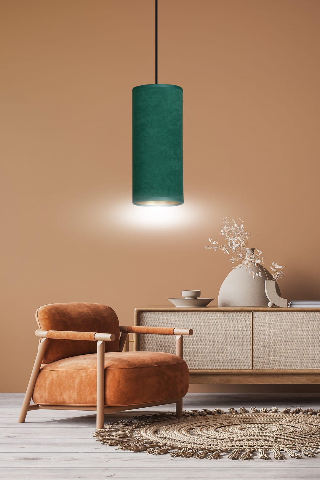 Lampa wisząca BENTE 1 BL GREEN od producenta Emibig to doskonały wybór dla osób, które pragną wprowadzić do swojego domu elegancję i nowoczesny klimat. Dzięki regulowanej długości przewodów, możesz łatwo dostosować ją do własnych potrzeb, co sprawia, że idealnie wpasuje się w przestrzeń salonu, jadalni czy biura. Abażur lampy wyprodukowano z trwałego materiału o welurowej fakturze, który zachwyca nie tylko estetyką, ale i jakością. Złoty środek abażura dodaje wyjątkowego charakteru, a subtelna kolorystyka zieleni wprowadza do wnętrza przyjemny, relaksujący klimat. Lampa jest dostępna w różnych wariantach kolorystycznych, takich jak czerń, biel, szarość, róż, a także w wersji z 1, 3 lub 4 źródłami światła, co sprawia, że spełni różnorodne oczekiwania.