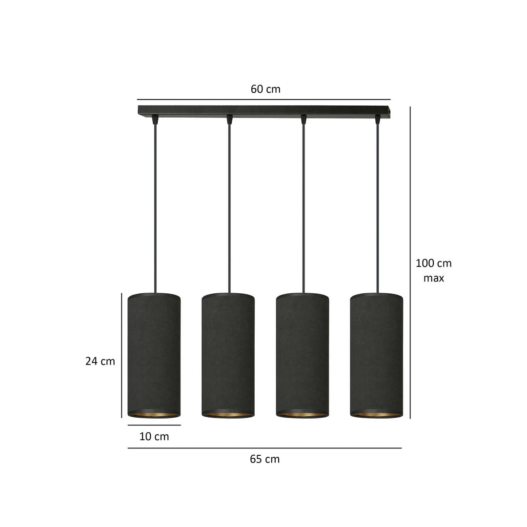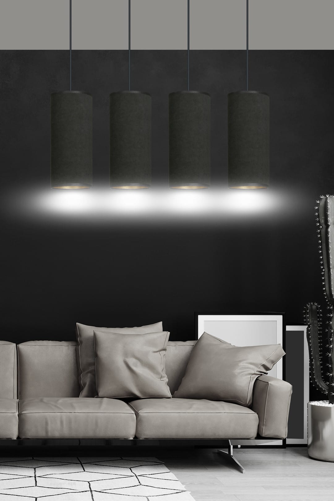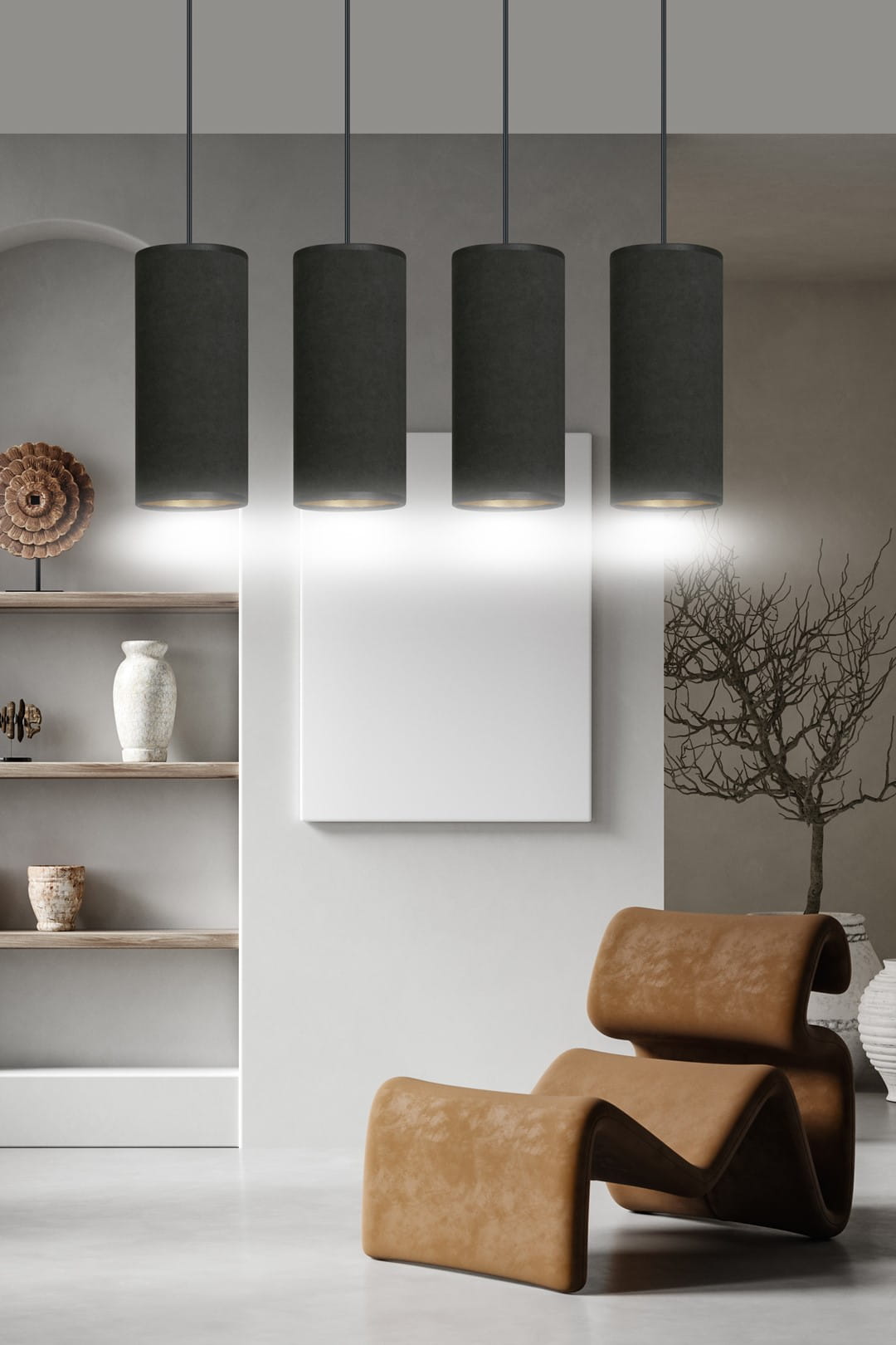 Lampa BENTE 4 BL BLACK to wyraz nowoczesnego stylu, który wprowadza elegancję do każdego wnętrza. Jej abażur, wykonany z trwałego materiału o welurowej fakturze, nie tylko przykuwa wzrok, ale także tworzy przytulną atmosferę dzięki złotemu wykończeniu w środku. Regulacja długości przewodów sprawia, że możesz dostosować wysokość lampy do własnych potrzeb, co czyni ją niezwykle funkcjonalnym elementem dekoracyjnym. Bez względu na to, czy urządzasz eleganckie wnętrze w klasycznym stylu, czy też nowoczesną przestrzeń, BENTE 4 BL BLACK idealnie wpisuje się w każdy projekt aranżacyjny. Do wyboru masz różne kolory abażurów - czarny, biały, szary, zielony i różowy - co pozwala na dopasowanie lampy do indywidualnych preferencji.