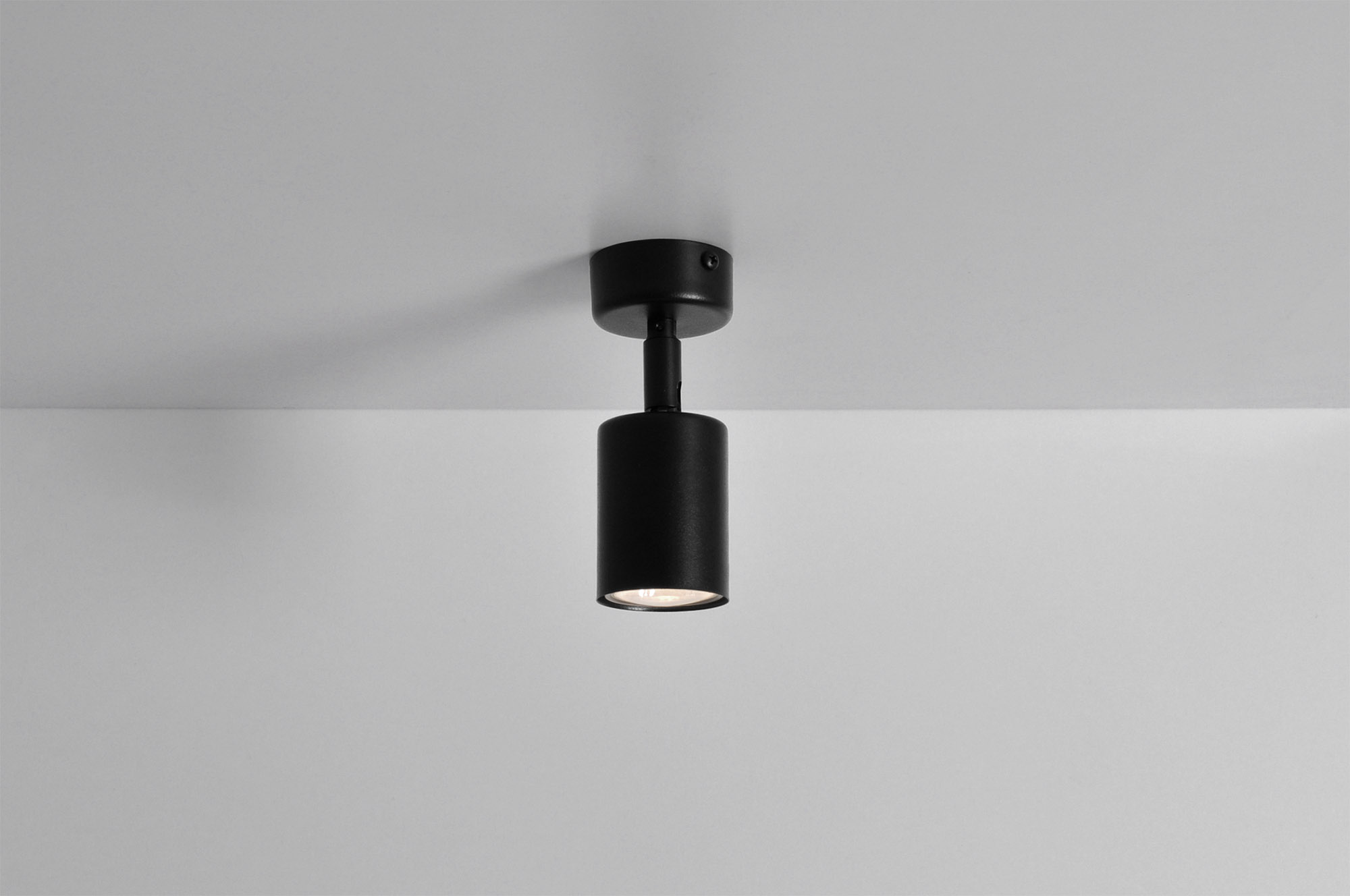 Pojedynczy punkt światła otoczono elegancką, czarną osłonką i przymocowano do okrągłej, niedużej podsufitki. Można nim manewrować na różne strony, aby dać światło na konkretny element w pokoju, albo skierować go bezpośrednio na ścianę, by odbijało się ono rozjaśniając przestrzeń pomieszczenia.