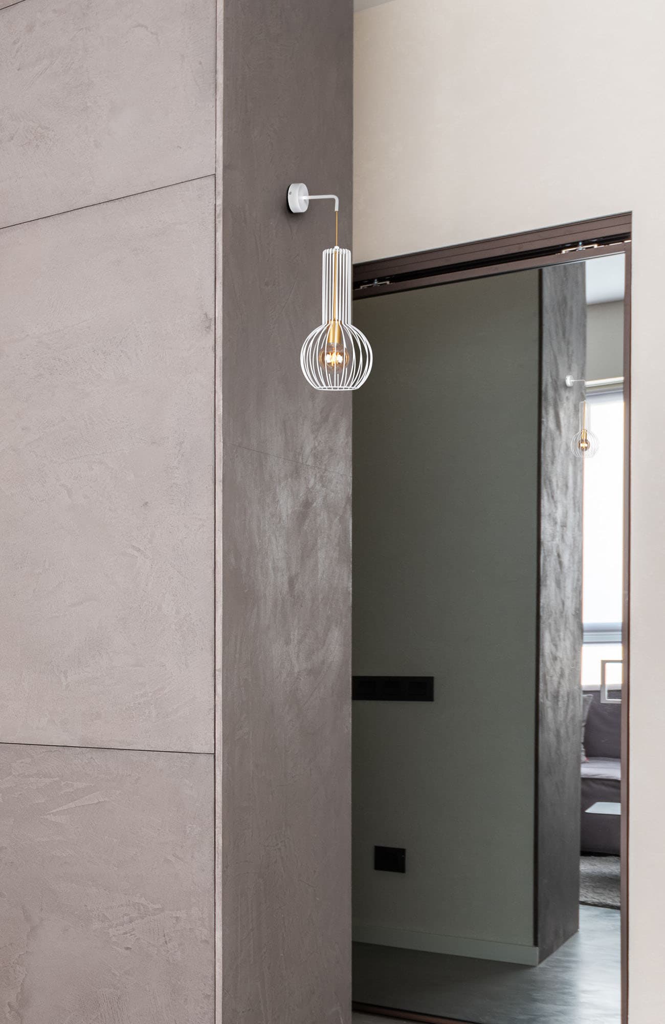 Industrialna seria z eleganckim sznytemSeria lamp ARVI WHITE została zaprojektowana w stylu loftowym, o czym świadczą surowe formy kloszy oraz miejsca na żarówkę, które pozostają niczym nieosłonięte. Takie oświetlenie stanowi idealną alternatywę dla typowych lamp wiszących jakie możemy spotkać w większości domów. Biała stylistyka podsufitki oraz prętów sprawia, że kompozycja jest przejrzysta i nie będzie przytłaczać wnętrza. Ważnym elementem dekoracyjnym serii są przewody oraz osłonki na żarówki w kolorze złotym. Z bielą tworzą ciekawą, elegancką kompozycję.
