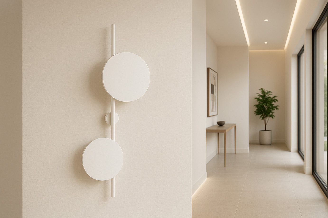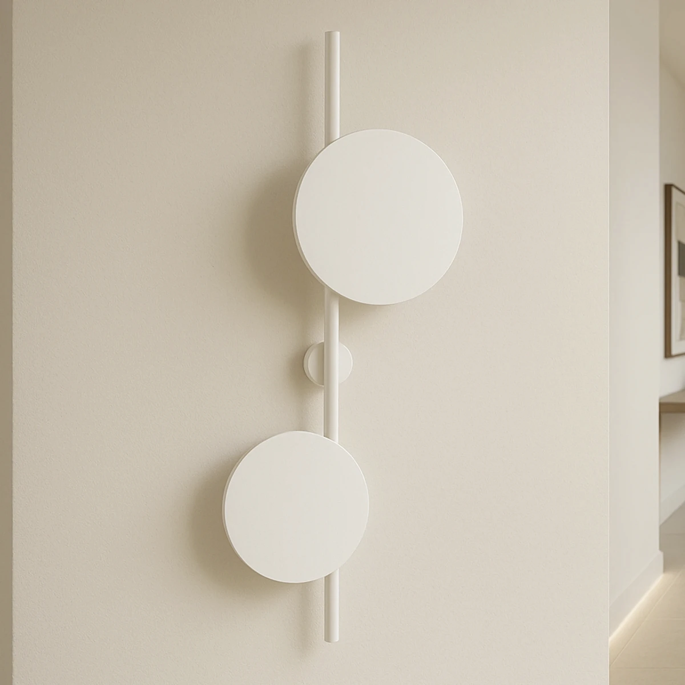 Funkcjonalna i nowoczesna lampaTe designerskie lampy ścienne są nie tylko funkcjonalnymi punktami świetlnymi, ale również modernistycznymi dekoracjami, które uzupełniają wnętrza w stylu loftowym, industrialnym lub minimalistycznym. Wydobywające się zza tarcz delikatne światło nadaje pomieszczeniu nietuzinkowego charakteru.Co jest dziś modne w oświetleniu? - zdecydowanie asymetria!Zastosowanie asymetrii dodaje lampom PERO nowoczesności. Dwie białe tarcze o różnych średnicach są zamocowane na prostej rurce, tworząc nie tylko źródło światła, ale także unikalną dekorację. Dwukierunkowe światło delikatnie wydobywa się zza metalowych tarcz, nadając wnętrzu stylowego charakteru. Lampa może być montowana zarówno pionowo, jak i poziomo. Można również łączyć różne modele z serii PERO, tworząc wyjątkową aranżację na całej ścianie.