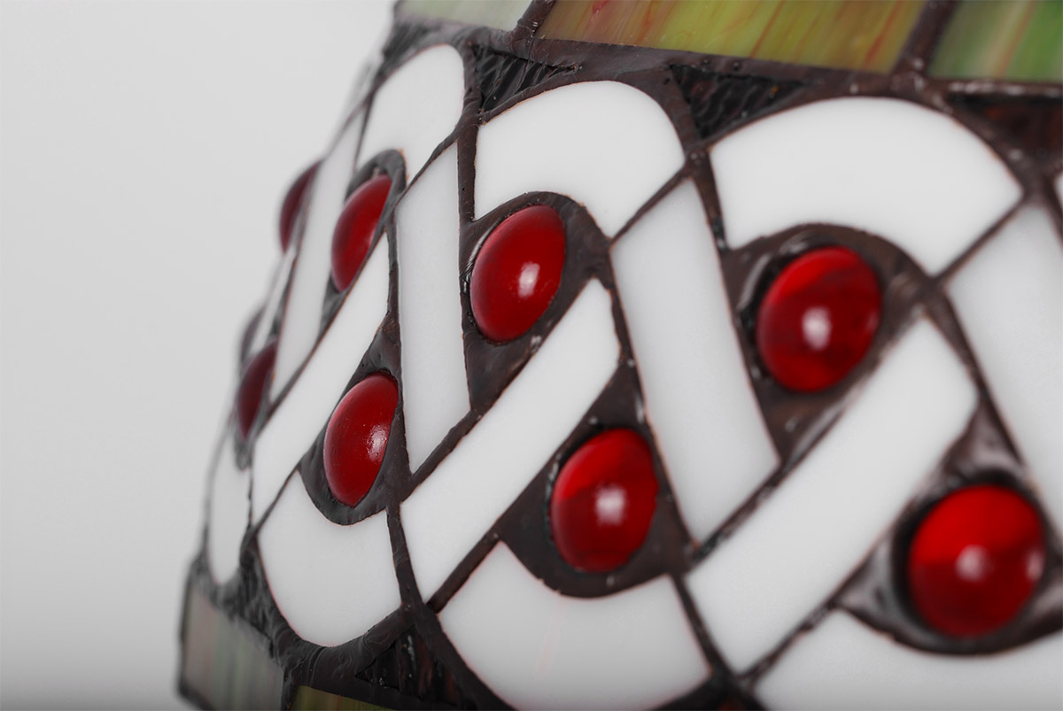 Seria TIFANY upiększy każde wnętrzeBez wątpienia najbardziej charakterystycznym elementem lampy jest witrażowy klosz o średnicy 41 centymetrów. Stanowi on zarówno piękną ozdobę jak i funkcjonalny element konstrukcji, który w piękny sposób rozprasza światło. W kolorystyce klosza dominuje jasny beż, urozmaicony nielicznymi, kolorowymi kafelkami w różnych odcieniach. Całość jest dodatkowo ozdobiona charakterystycznym wzorem przypominającym przeplatającą się linę. Motyw ten towarzyszy zresztą innym modelom z serii TIFANY, która obejmuje również lampę stołową oraz lampę wiszącą.