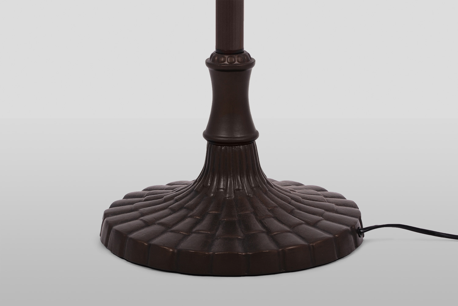 Na wyróżnienie zasługuje tutaj również zdobiona noga z ciemnego metalu, której zarówno kolor jak i forma, doskonale pasują do witrażowego klosza i tworzą spójną całość. Warto również wspomnieć, że lampa ma 157 centymetrów wysokości i jest wykonana w całości z metalu i szkła, a także mieści w sobie dwa gniazda na żarówki E27, których maksymalna moc może wynosić 60W.