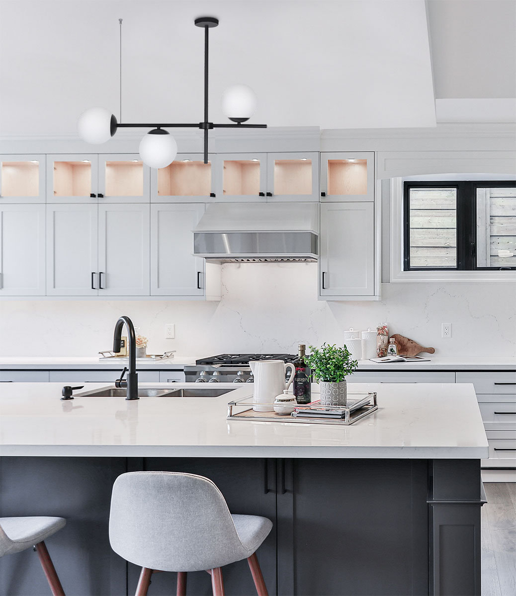 Klasyka spotyka styl loftWyznacznikiem serii VUELTA są szklane klosze uformowane z mlecznego szkła - jest to odwołanie do tradycyjnych technik wzorniczych w oświetleniu. Białe kule wzorowo przyozdabiają całą konstrukcję dodając szykownego wydźwięku. Szkielet lampy stanowią dwa czarne, metalowe ramiona, skrzyżowane ze sobą pod kątem prostym. Przywodzą one na myśl statyw lub surowe pręty wystające z sufitu w przestrzeniach pofabrycznych. Designerska lampa z czterema punktami światłaNajmniejsza propozycja z serii VUELTA idealnie sprawdzi się nad wyspą kuchenną bądź stołem w jadalni. Dzięki niewielkim rozmiarom nie przytłoczy aranżacji wnętrza, ale dopełni ją, tworząc ciekawy efekt w pomieszczeniu. Trzy źródła światła zostały umieszczone na poprzecznym ramieniu i skierowane w różnych kierunkach, dzięki czemu odpowiednio doświetlą pomieszczenie. W projekcie zastosowano uniwersalne gwinty E27, do których bez problemu dopasujesz odpowiadające Ci żarówki pod względem barwy oraz mocy (max. 40W). Pamiętaj, że w zależności od temperatury barwowej żarówki, kolor kloszy będzie zmieniał swoje tony. Przy zastosowaniu żarówek o ciepłej barwie będą to żółtopomarańczowe tony, natomiast o zimnej - niebieskawe.