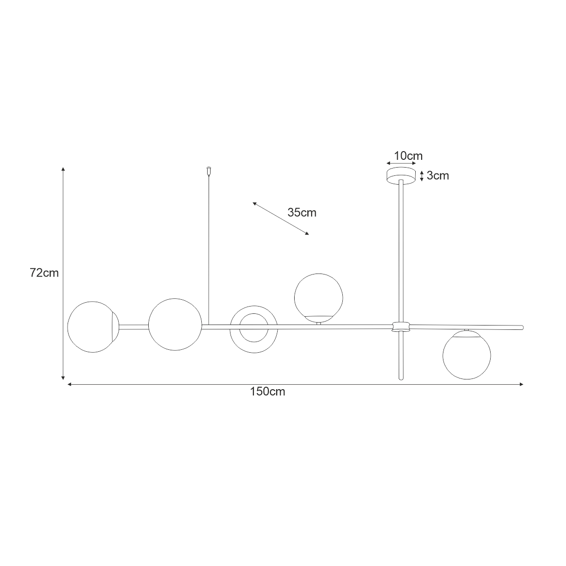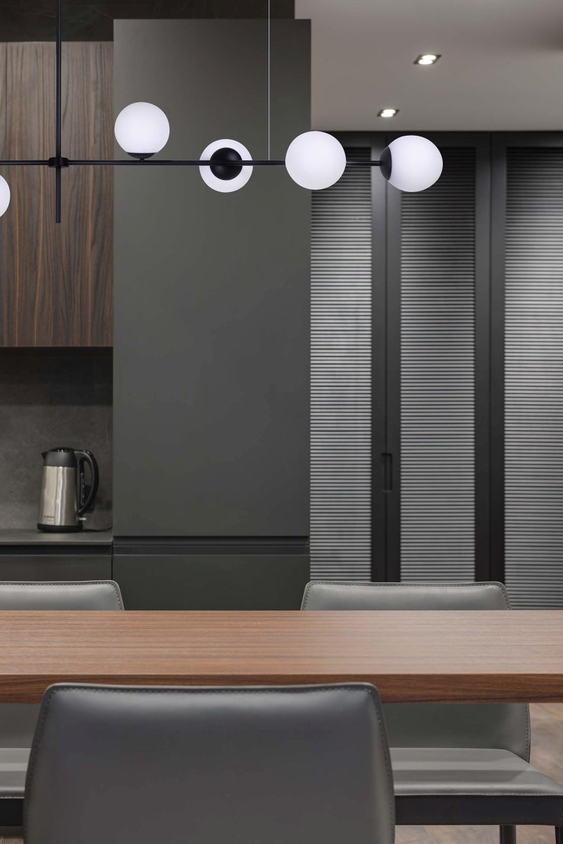 Klasyka spotyka styl loftWyznacznikiem serii VUELTA są szklane klosze uformowane z mlecznego szkła - jest to odwołanie do tradycyjnych technik wzorniczych w oświetleniu. Białe kule wzorowo przyozdabiają całą konstrukcję dodając szykownego wydźwięku. Szkielet lampy stanowią dwa czarne, metalowe ramiona, skrzyżowane ze sobą pod kątem prostym. Przywodzą one na myśl statyw lub surowe pręty wystające z sufitu w przestrzeniach pofabrycznych.Designerska lampa z pięcioma punktami światłaTa propozycja idealnie sprawdzi się nad wyspą kuchenną bądź stołem w jadalni. Dzięki poprzecznej budowie podkreśli wydłużone blaty i odpowiednio je doświetli. Swoją nienachalną formą nie przytłoczy aranżacji wnętrza, ale dopełni ją, tworząc ciekawy efekt w pomieszczeniu. Pięć źródeł światła zostało umieszczonych na podłużnym ramieniu i skierowanych w różnych kierunkach. W projekcie zastosowano uniwersalne gwinty E27, do których bez problemu dopasujesz odpowiadające Ci żarówki pod względem barwy oraz mocy (max. 40W). Pamiętaj, że w zależności od temperatury barwowej żarówki, kolor kloszy będzie zmieniał swoje tony. Przy zastosowaniu żarówek o ciepłej barwie będą to żółtopomarańczowe tony, natomiast o zimnej - niebieskawe.