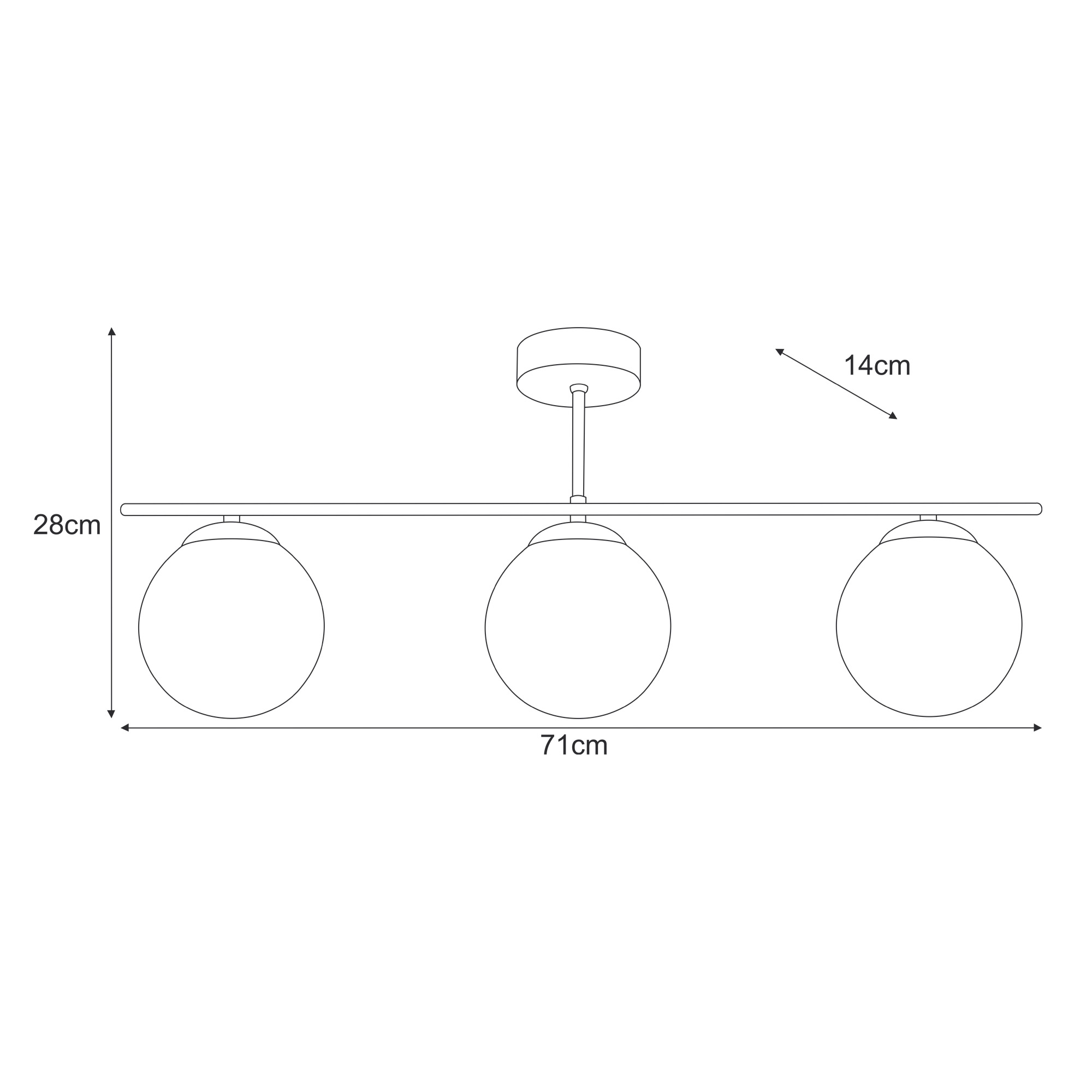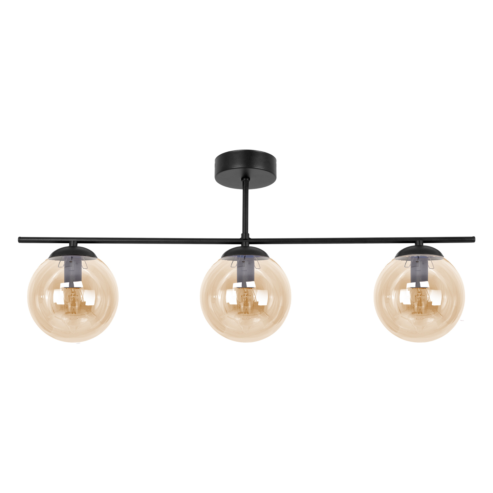 Solidna lampa do Twojego wnętrzaTa lampa sufitowa ma nowoczesny, minimalistyczny design, który nadaje wnętrzu elegancki i stylowy wygląd. Składa się z trzech głównych punktów świetlnych, które są zawieszone na poziomej belce. Każdy z tych elementów to szklana kula w kolorze bursztynowym, co dodaje ciepłego i przytulnego światła. Kule są półprzezroczyste, co pozwala na swobodne rozproszenie światła i tworzenie przyjemnej atmosfery w pomieszczeniu.