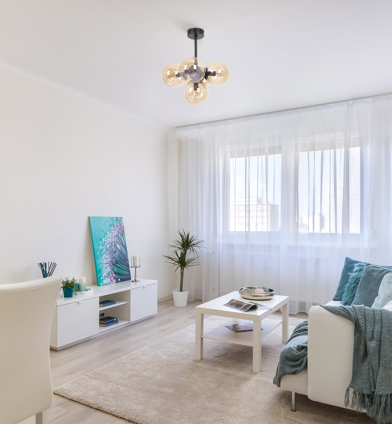 Klosz w bursztynowym odcieniu nie tylko dodaje elegancji, ale także tworzy niezwykłą atmosferę w pomieszczeniu, łagodząc światło i nadając mu przyjemny, miękki charakter. Dzięki temu lampa K-5367 jest idealna do salonu, jadalni, sypialni czy korytarza, gdzie subtelne oświetlenie jest kluczowe. Czarne wykończenie nadaje jej nowoczesny wygląd, a bursztynowe klosze dodają ciepła, tworząc harmonijną całość.