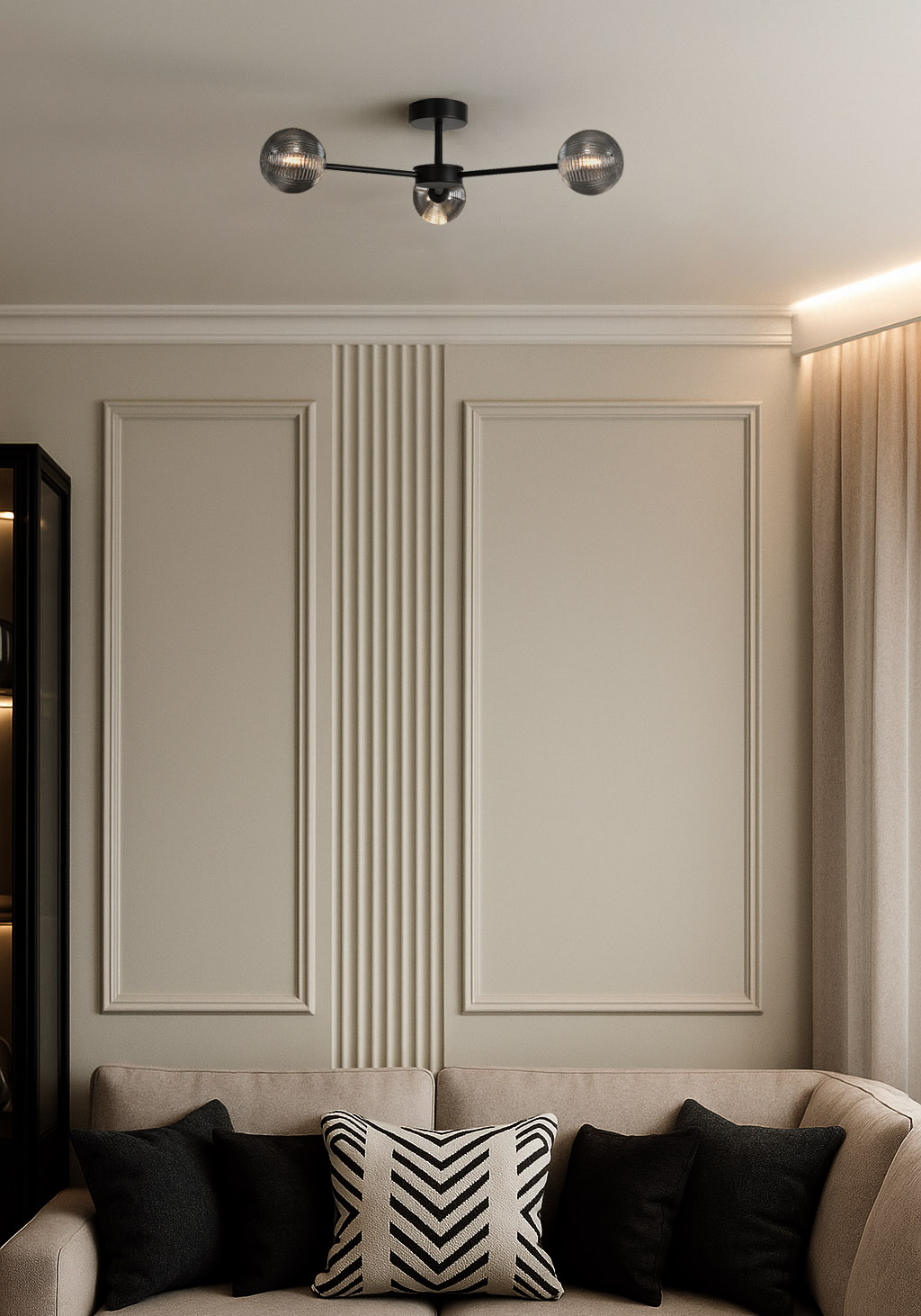 Lampa sufitowa K-5716 z serii GRETA – elegancja i nowoczesność w Twoim wnętrzuLampa sufitowa K-5716 z serii GRETA to połączenie nowoczesnego designu i funkcjonalności, które doda charakteru każdemu pomieszczeniu. Jej unikalna konstrukcja składa się z trzech metalowych drążków, wychodzących z centralnej części lampy. Na każdym z drążków znajduje się ryflowany, grafitowy klosz, który zapewnia efektowne i równomierne rozproszenie światła, wprowadzając do wnętrza przyjemną atmosferę.
