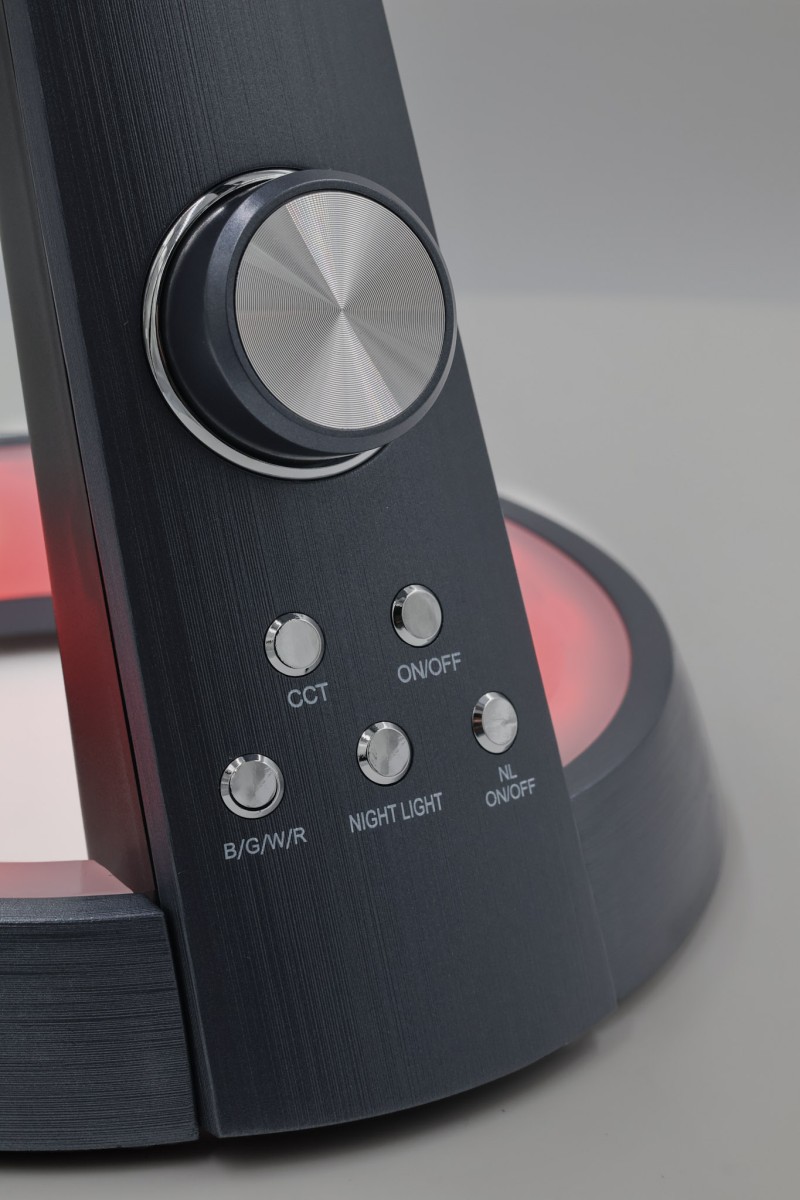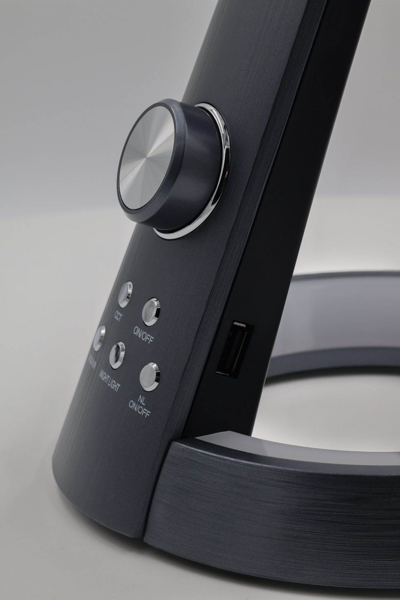 W lampce znajduje się również praktyczne gniazdo USB, które umożliwia ładowanie telefonu lub innych urządzeń mobilnych bez potrzeby korzystania z dodatkowego zasilacza – wygodne rozwiązanie szczególnie przy ograniczonej liczbie gniazdek. Z kolei panel sterujący pozwala na szybkie włączanie, wyłączanie, zmianę trybów i ustawianie światła nocnego, co sprawia, że obsługa lampki jest prosta i przyjemna..