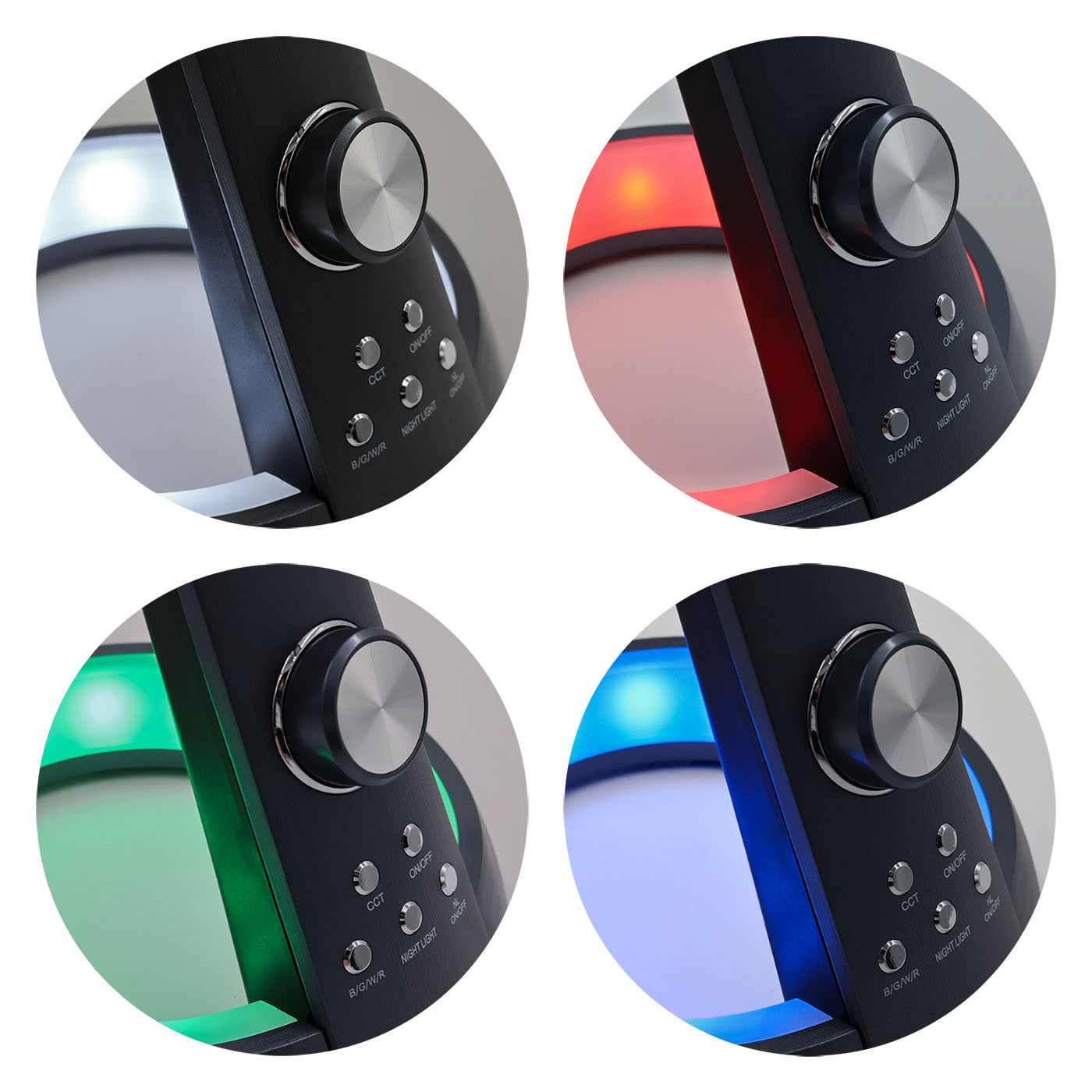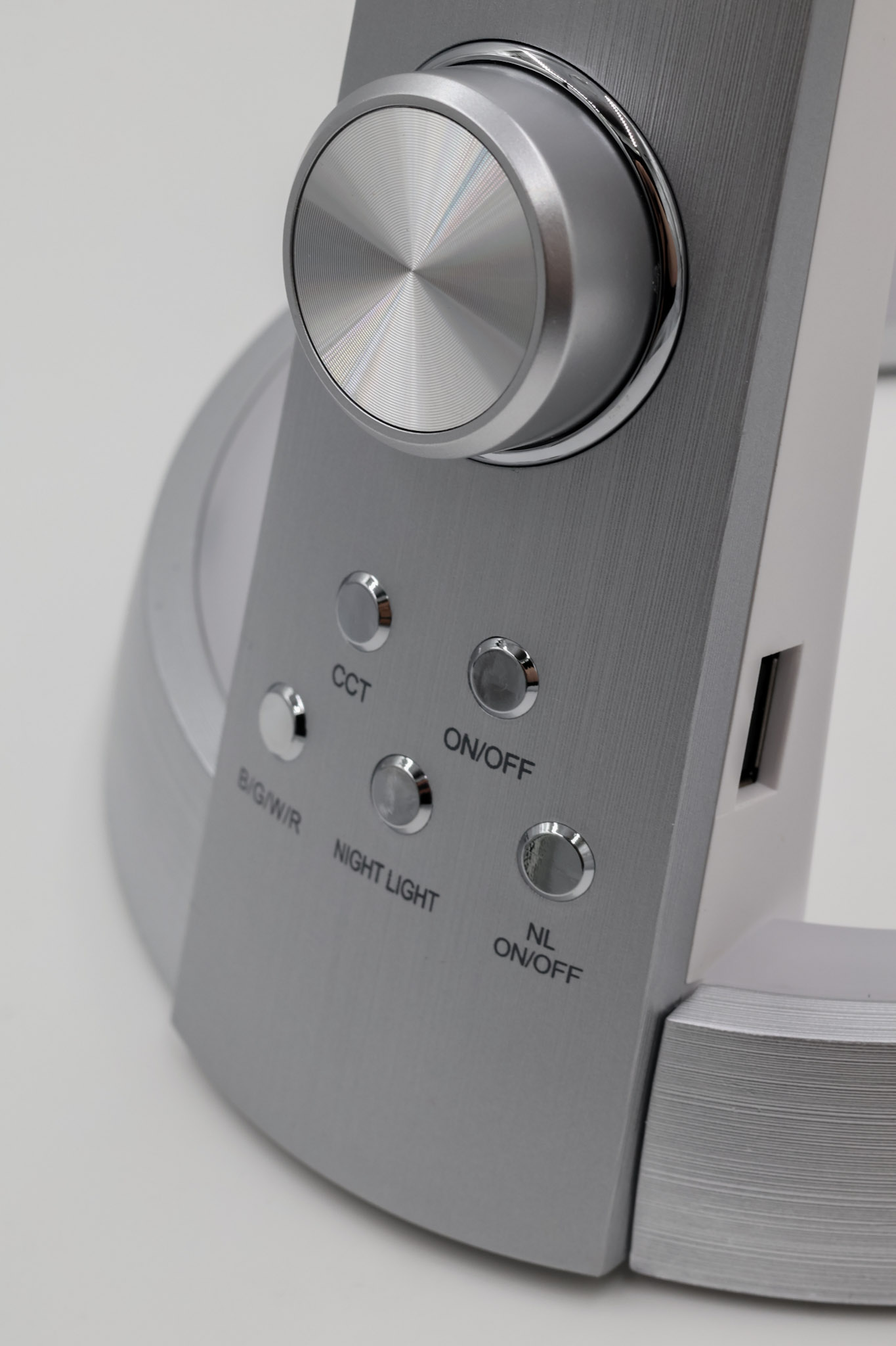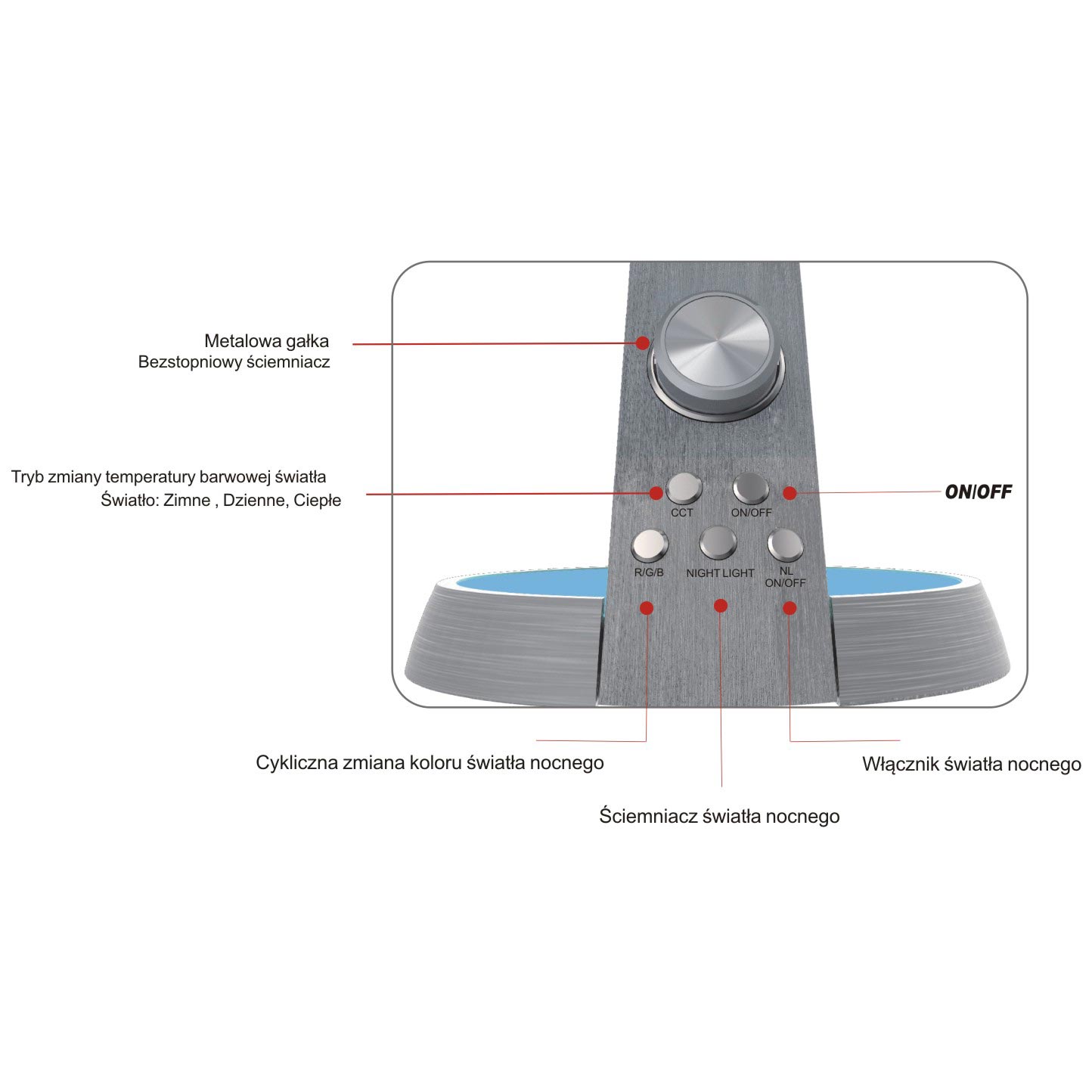 Precyzyjne dopasowanie światła – komfort na Twoich zasadachDzięki regulowanej temperaturze barwowej w zakresie 3000–6300K oraz płynnemu ściemniaczowi sterowanemu stylowym pokrętłem, możesz dostosować oświetlenie do każdej sytuacji – chłodne światło do porannej koncentracji, neutralne do codziennych obowiązków i ciepłe wieczorem, gdy chcesz dać odpocząć oczom. To jednak nie wszystko. Lampa BERKANE oferuje także tryb nocny oraz podświetlenie podstawy ze zmianą koloru, które tworzy przyjemny, relaksujący nastrój w pokoju. To doskonała funkcja np. w pokoju młodzieżowym, gdzie estetyka i klimat są równie ważne jak funkcjonalność.Przemyślany design i nowoczesne dodatkiWyjątkowy design w odcieniach srebra i szarości, z obudową imitującą szczotkowaną stal, nadaje lampie elegancki, nieco industrialny wygląd. To doskonały wybór do nowoczesnych, minimalistycznych wnętrz, ale również ciekawy kontrapunkt dla bardziej klasycznych aranżacji. Wbudowane gniazdo USB to wygodne rozwiązanie, które pozwala ładować telefon lub inne urządzenia bez konieczności sięgania po dodatkowy kabel. Przy wymiarach 42,5 × 34 × 18 cm, lampa nie zajmuje dużo miejsca, a jej LED-owe źródło światła o mocy 8W i 790 lumenach jest wydajne, energooszczędne i bezpieczne dla oczu. Seria BERKANE dostępna jest także w wersji czarnej, co pozwala jeszcze lepiej dopasować lampę do stylu Twojego wnętrza.