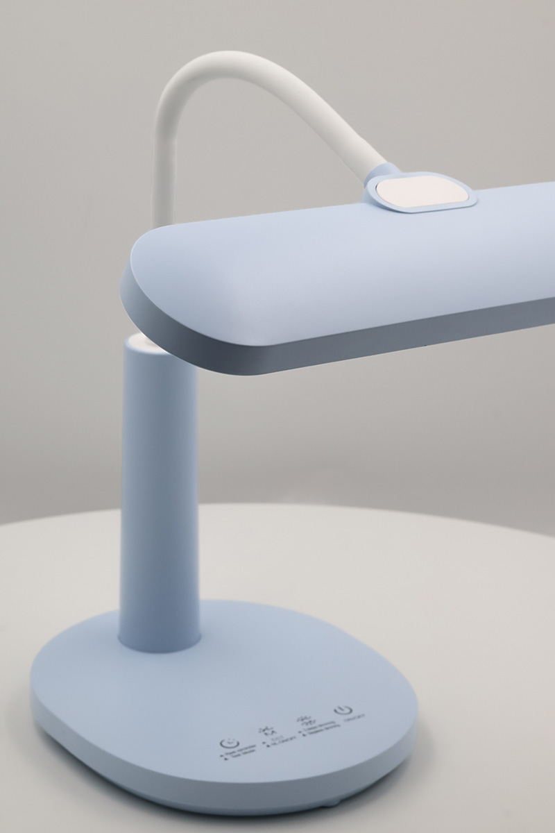 Twój funkcjonalny niezbędnikNiezwykle urocza lampka biurkowa Milo w pięknym bladoniebieskim kolorze zachwyca nie tylko pod względem wizualnym, ale również praktycznym. Może poszczycić się kilkoma funkcjami, które pozwolą Ci łatwo dopasować lampkę do własnych potrzeb oraz z pewnością ułatwią Ci codzienne życie. Pierwszą z nich jest silikonowe ramię, które pozwala na regulację kąta oraz kierunku padania światła, dzięki czemu możesz szybko skierować strumień świetlny tam, gdzie akurat tego potrzebujesz. Dodatkowo, na dotykowym panelu umieszczonym na podstawie lampki znajdziesz kilka niesamowicie przydatnych funkcji takich jak dwustopniowy ściemniacz, który pozwoli Ci zmienić natężenie światła, a także przycisk do zmiany temperatury barwowej w zakresie 3000-5700K. W zależności od charakteru wykonywanej czynności samodzielnie dobierasz pożądaną barwę światła. Dodatkowo, dłuższe naciśnięcie przycisku „CCT” włącza tryb oświetlenia nocnego, który po wybudzeniu uwalnia niewielką ilość światła o ciepłej barwie ułatwiającego zasypianie.