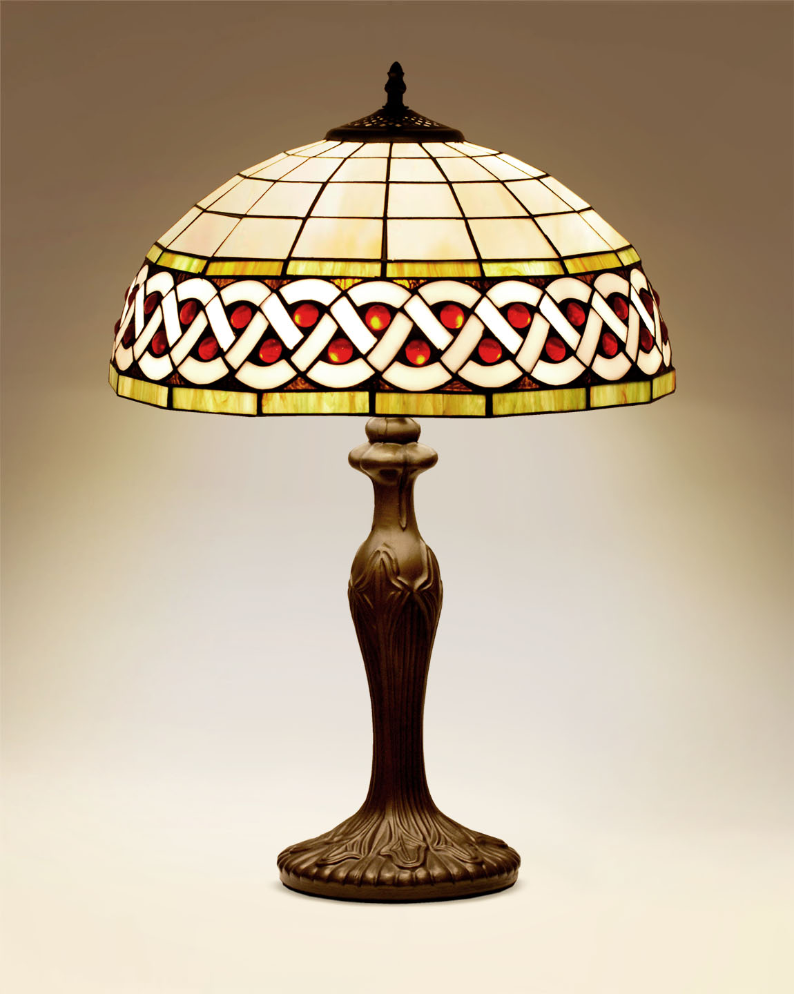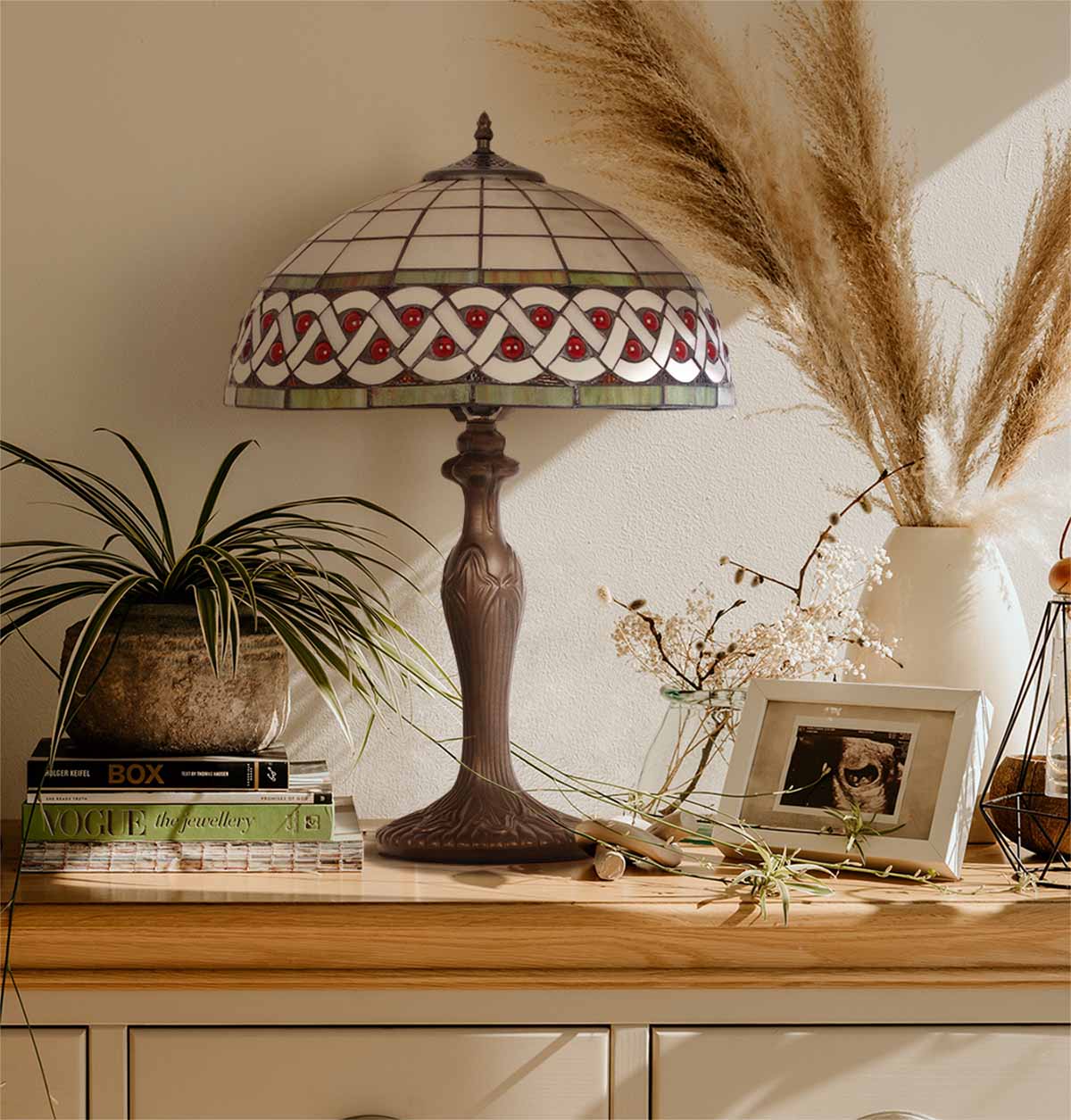 Elegancka lampa TIFANYLampka stołowa K-G162208 to świetne rozwiązanie dla każdego wielbiciela luksusowego oświetlenia. Model, inspirowany kultowymi lampami Tiffany, z witrażowym kloszem, czyli z kawałkami kolorowego szkła, ułożonymi we wzór. Podstawa wykonana z metalu, przypomina klasyczne, wykonane z brązu. Lampa w stylu Art. Deco, będzie współgrało z wnętrzem zachowanym w nurcie vintage, w którym spotkamy przedmioty o „starym” wyglądzie, z duszą. Można także umieścić je w salonie czy innym pomieszczeniu w stylu rustykalnym. Lampka będzie doskonale się prezentowała w restauracjach urządzonych w takim klimacie.