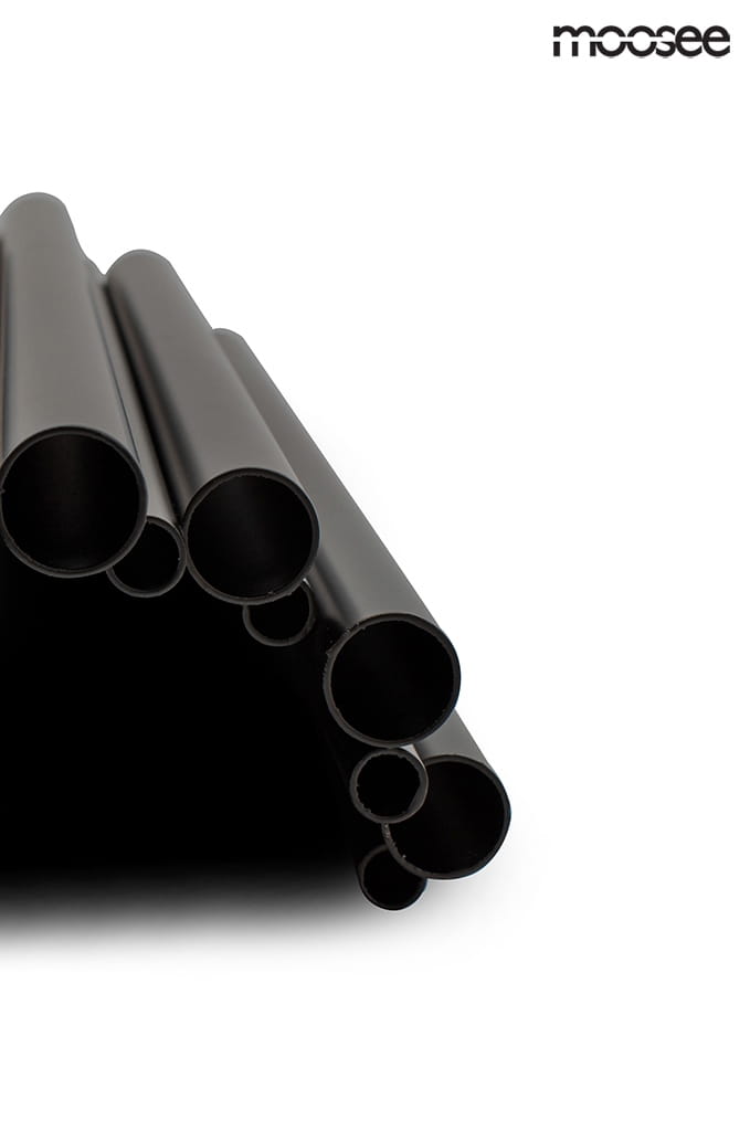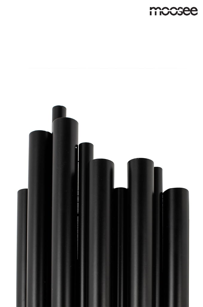 Czarny kinkiet ścienny HARMONIC BLACK od Moossee to przykład oświetlenia, które buduje przestrzeń nie tylko światłem, ale także formą. Składa się z zespołu metalowych, pionowych rur o zróżnicowanej długości, tworzących spójną i dynamiczną całość. Ten kinkiet przyciąga wzrok nawet wtedy, gdy światło jest wyłączone. To model, który dobrze odnajduje się w przestrzeniach wymagających wyrazistego akcentu – zarówno domowych, jak i komercyjnych.