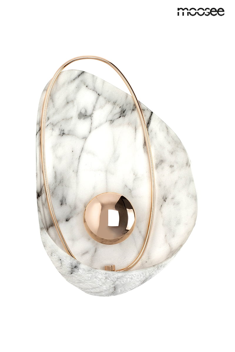 MOOSEE lampa ścienna ROCK to wyjątkowy element oświetlenia, który łączy ponadczasowy design z inspiracjami czerpanymi z natury. Główny element przypominający wydrążoną marmurową skałę został precyzyjnie wykonany z żywicy, co nadaje lampie unikalny wygląd. Wewnątrz umieszczono stalową, owalną konstrukcję, skrywającą źródło światła LED, która dopełnia całości i podkreśla jej nowoczesny charakter.