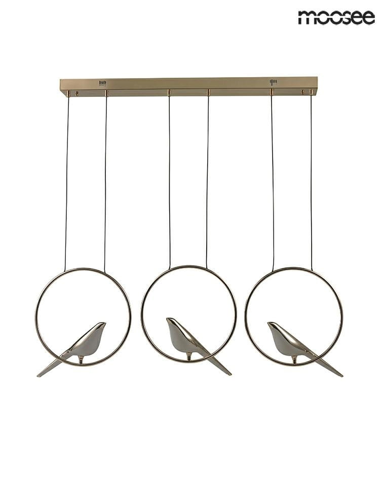 MOOSEE złota lampa wisząca BIRD LINE to propozycja dla tych, którzy szukają niestandardowego oświetlenia w minimalistycznym, a zarazem ozdobnym wydaniu. Model opiera się na trzech pierścieniach zawieszonych w linii, z których każdy skrywa dekoracyjnego ptaka – symbol lekkości, spokoju i równowagi. Całość zamontowana jest na podłużnej podsufitce, dzięki czemu dobrze rozkłada światło nad długimi powierzchniami.