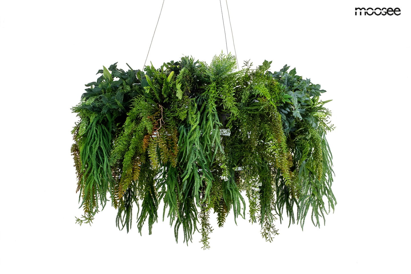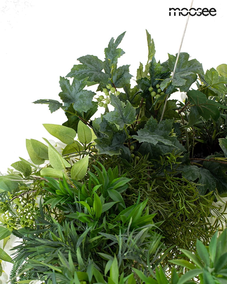 MOOSEE lampa wisząca GARDENS 90 czarna łączy oświetlenie z elementami przypominającymi naturalną roślinność. Okrągła konstrukcja o średnicy 90 cm opiera się na czarnym stelażu, nad którym rozpościera się gęsta kompozycja zieleni. Dzięki temu model GARDENS pełni nie tylko funkcję oświetlenia, ale również dekoracji we wnętrzach.