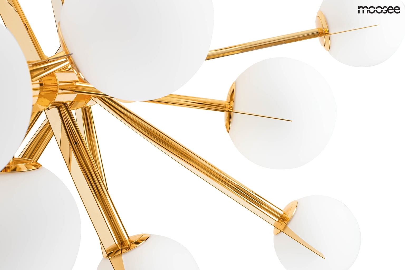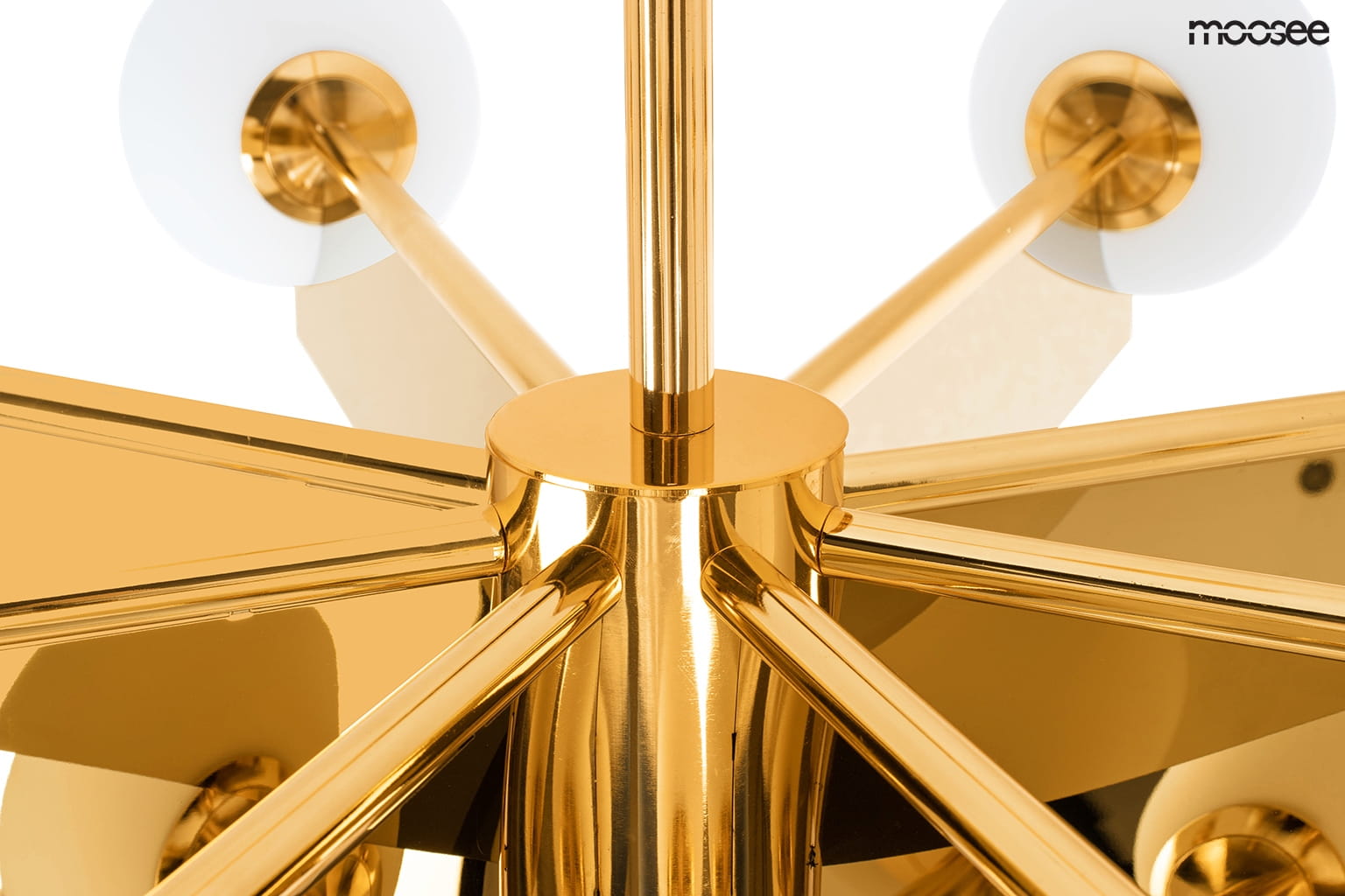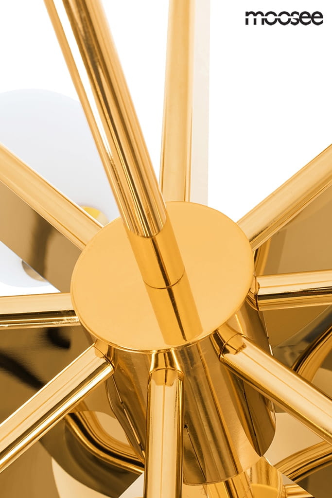 Ozdobna forma, połączenie koloru złotego z mlecznymi kloszami nadaje jej szyku i elegancji.
