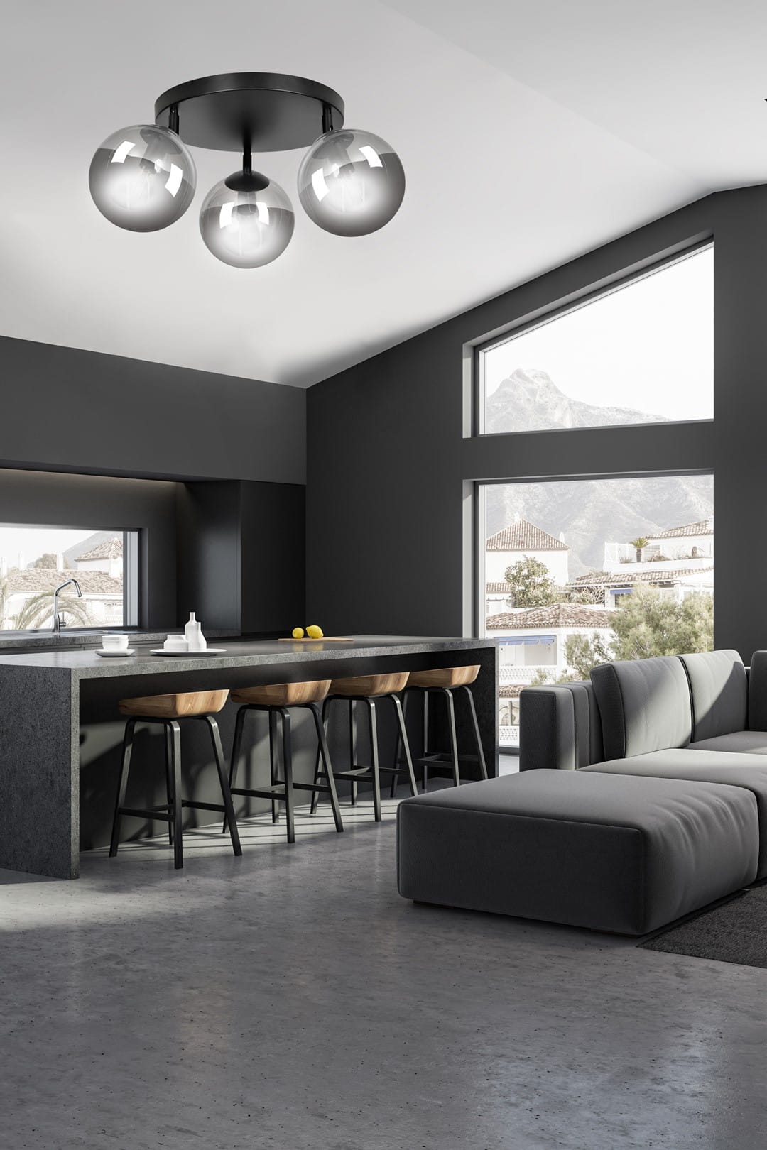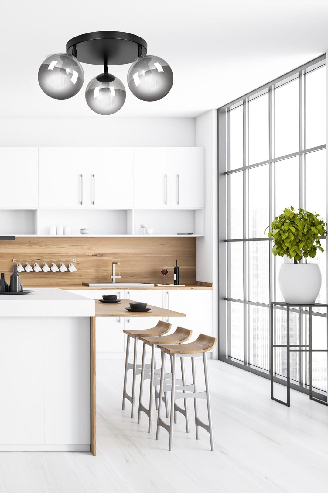- Podkreślenie nowoczesnego stylu wnętrz z wykorzystaniem różnych kolorów kloszy: grafitowego, miodowego i transparentnego.