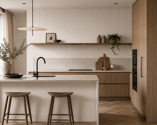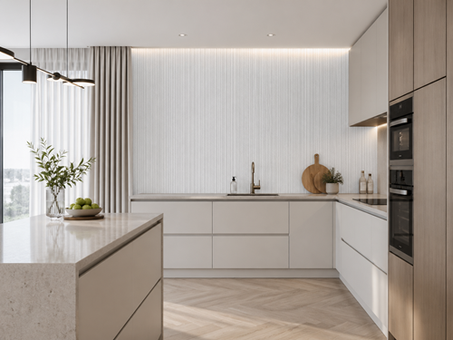 W kuchniach otwartych na salon dobrze sprawdzają się tapety, które łączą obie części. Nie muszą być bardzo kuchenne. Czasem imitacja kamienia albo miękka geometria lepiej pasuje niż motywy z filiżankami, ziołami czy napisami.