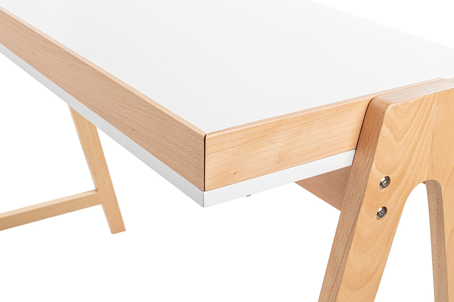 Blat biurka wykonany został z płyty meblowej malowanej na kolor biały, natomiast nogi biurka wykonane są z drewna bukowego.