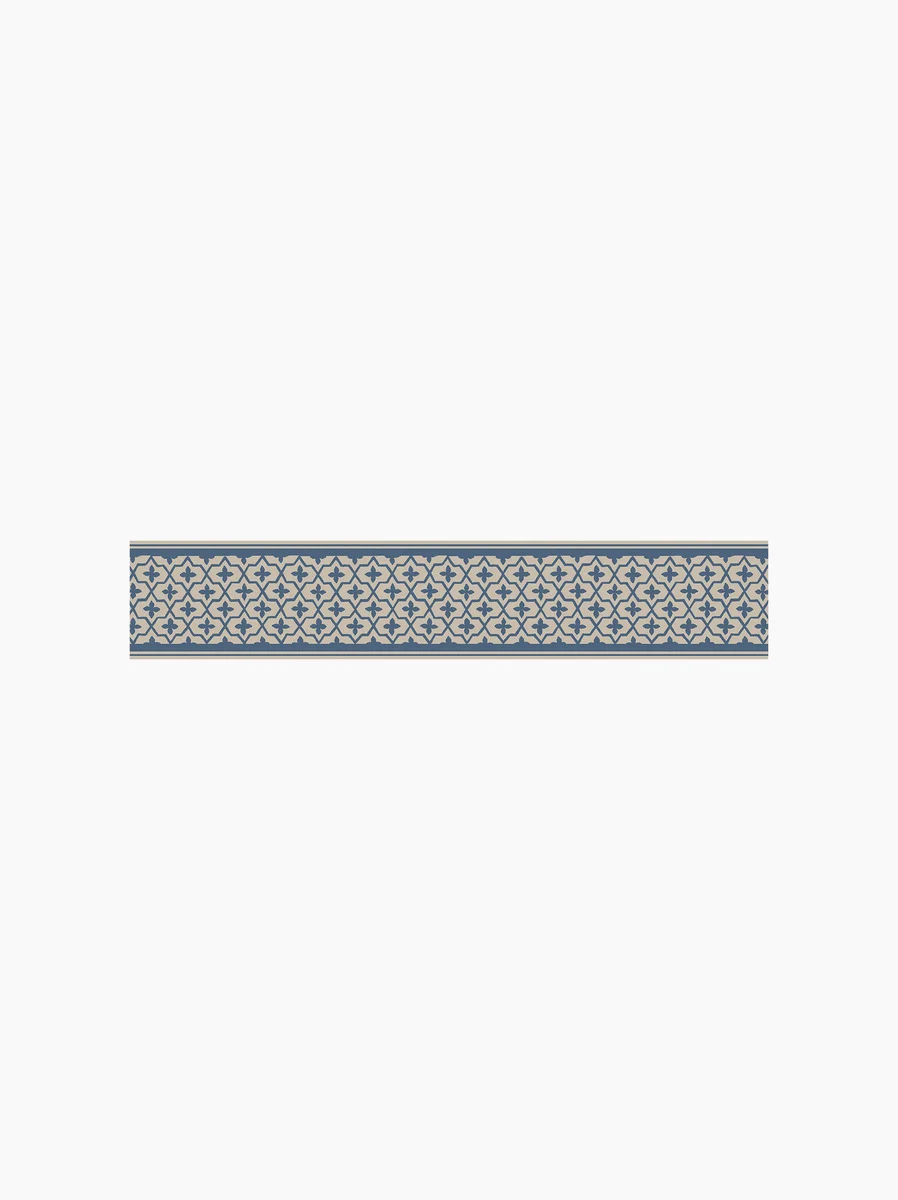 Kolorystyka łączy niebieskie detale z ciepłym beżowym tłem, dzięki czemu bordiura dobrze komponuje się zarówno z jasnymi tapetami, jak i z bardziej wyrazistymi kolorami ścian. Ornament jest niewielki i powtarzalny, dlatego tworzy równy dekoracyjny pas bez dominowania całej ściany.