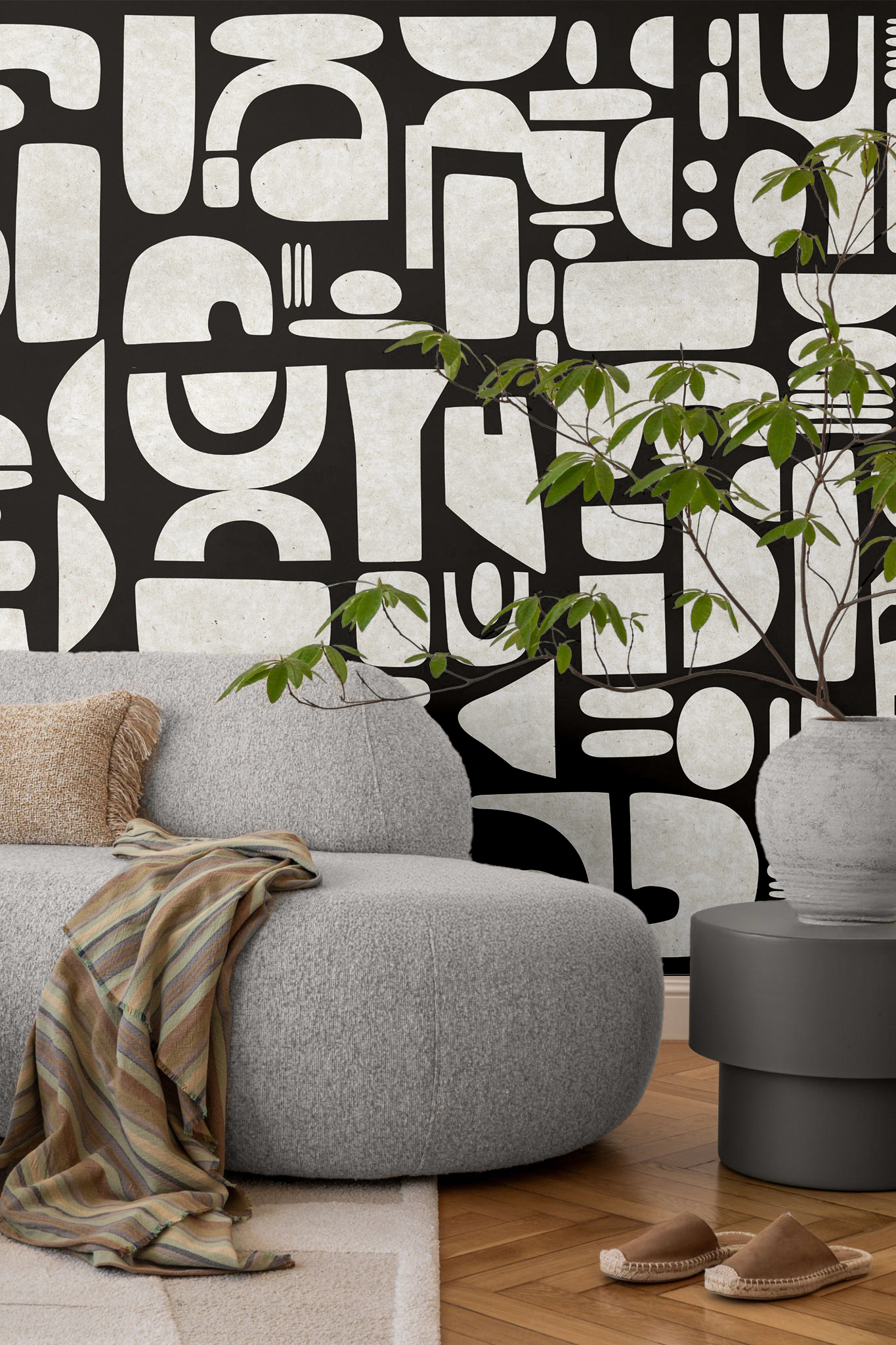 Abstrakcyjne kształty nawiązują do dawnych symboli i geometrycznych układów, a jednocześnie pozostają bardzo współczesne i uniwersalne. Dzięki temu AZTEC dobrze odnajduje się zarówno w aranżacjach minimalistycznych, jak i tych bardziej eklektycznych. To tapeta, która może działać jako spokojne tło albo mocniejszy akcent graficzny, zależnie od światła, dodatków i całego charakteru pomieszczenia.