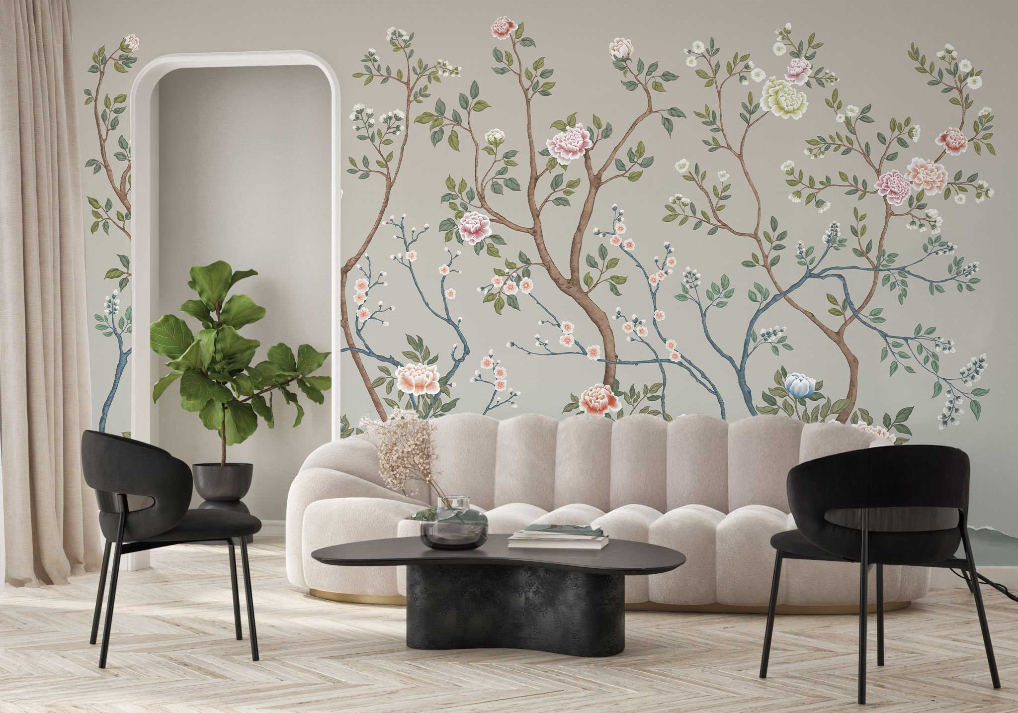 Wzór ma w sobie coś z ilustracji, dlatego dobrze wygląda zarówno we wnętrzach klasycznych, jak i bardziej nowoczesnych. To tapeta roślinna, która dekoruje ścianę, ale nie przejmuje całej uwagi. Dzięki temu łatwo zestawić ją z drewnem, jasnymi tkaninami, prostymi meblami i stonowanymi dodatkami.