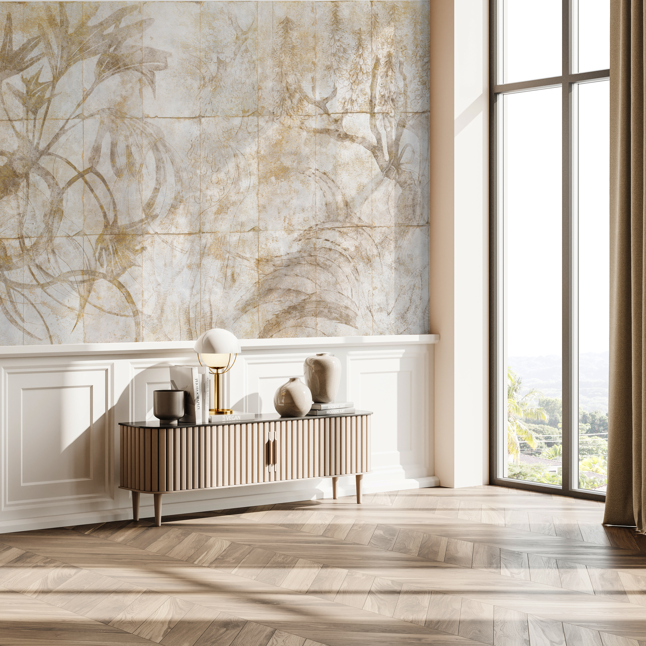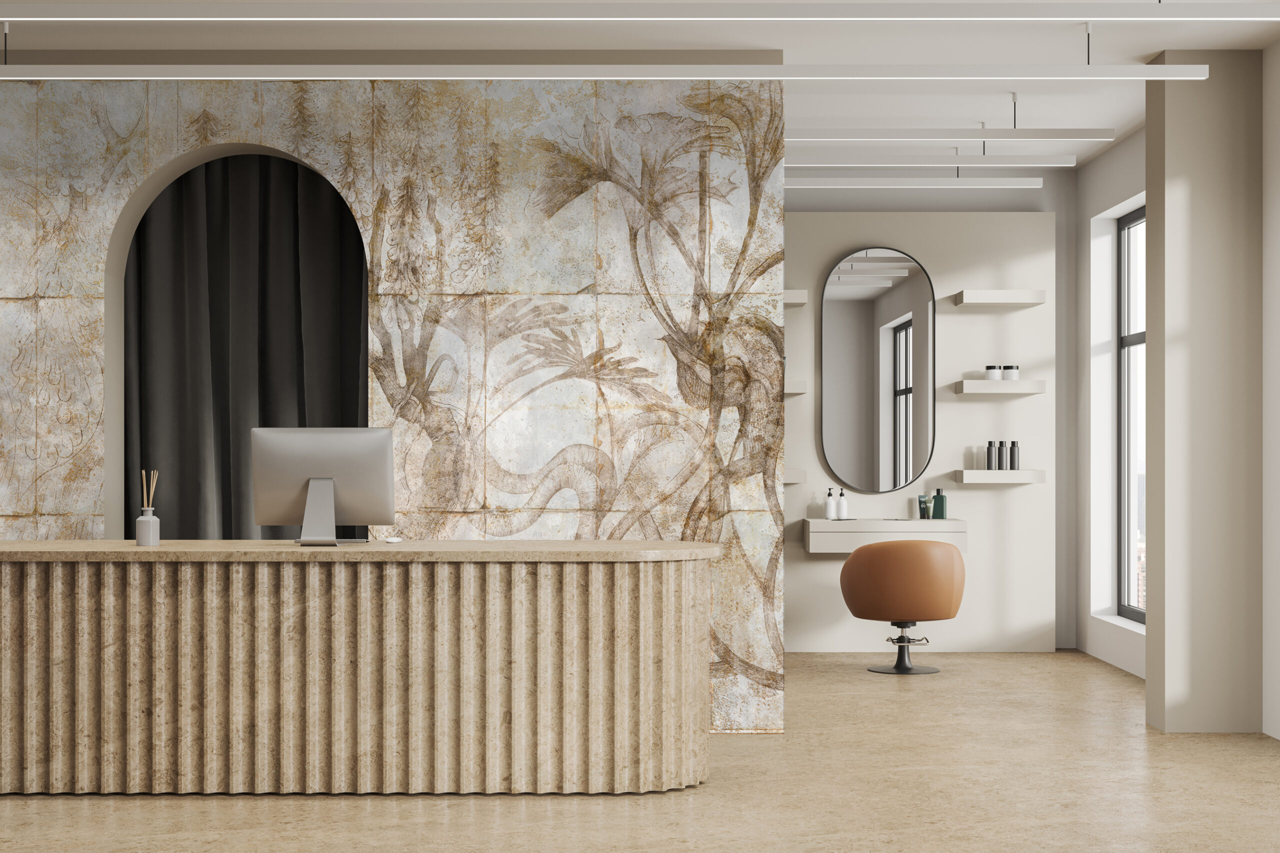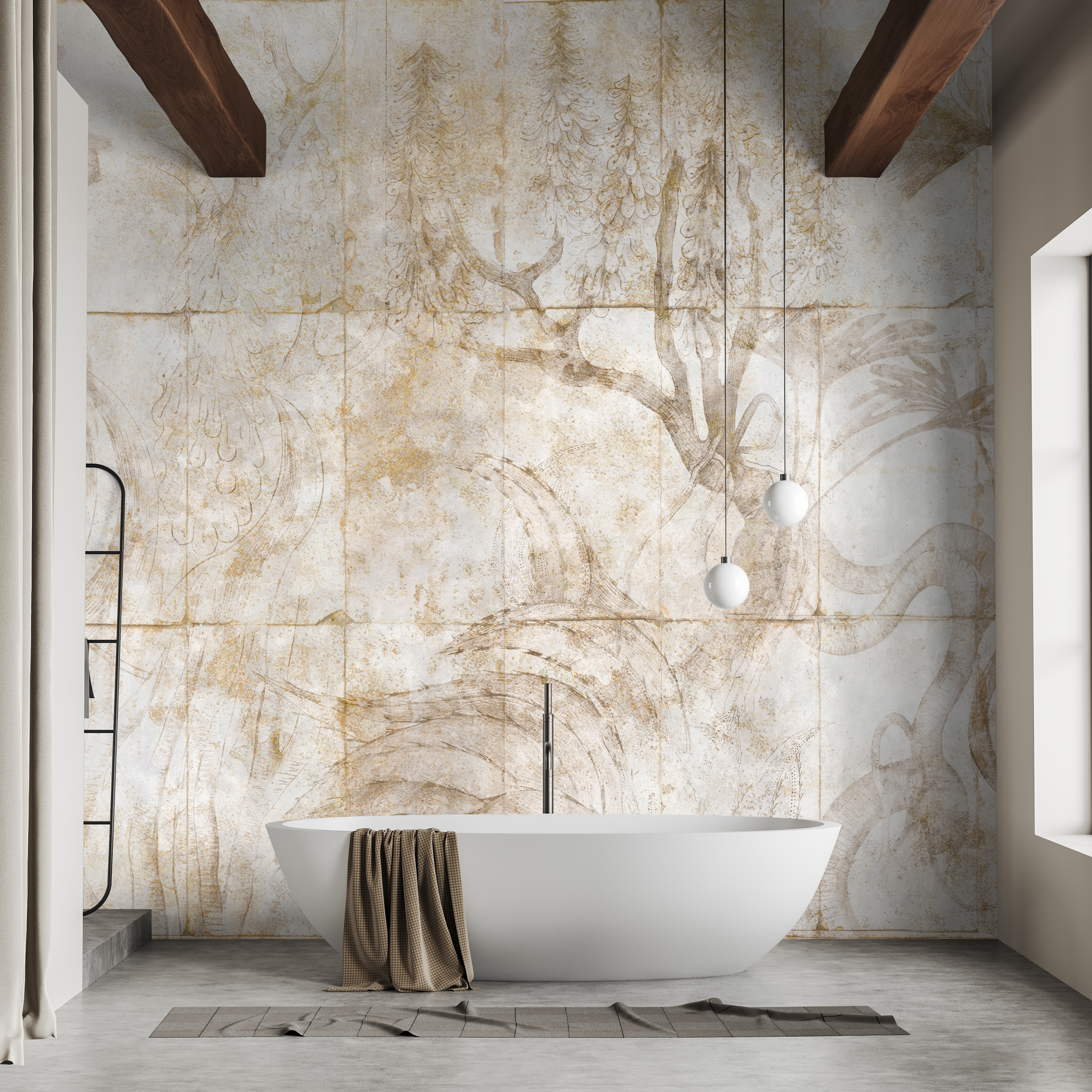 Tapeta Wall and More HERBA 25136 21A wygląda jak współczesny fresk z roślinnym motywem. Rysunki roślin przypominają szkice z dawnych zielników, a tło ma lekko surową, przecieraną strukturę, która dodaje całości głębi. Dzięki temu wzór nie jest płaski ani oczywisty. Ściana zyskuje wyraźny charakter, ale nadal pozostaje spokojna w odbiorze.
