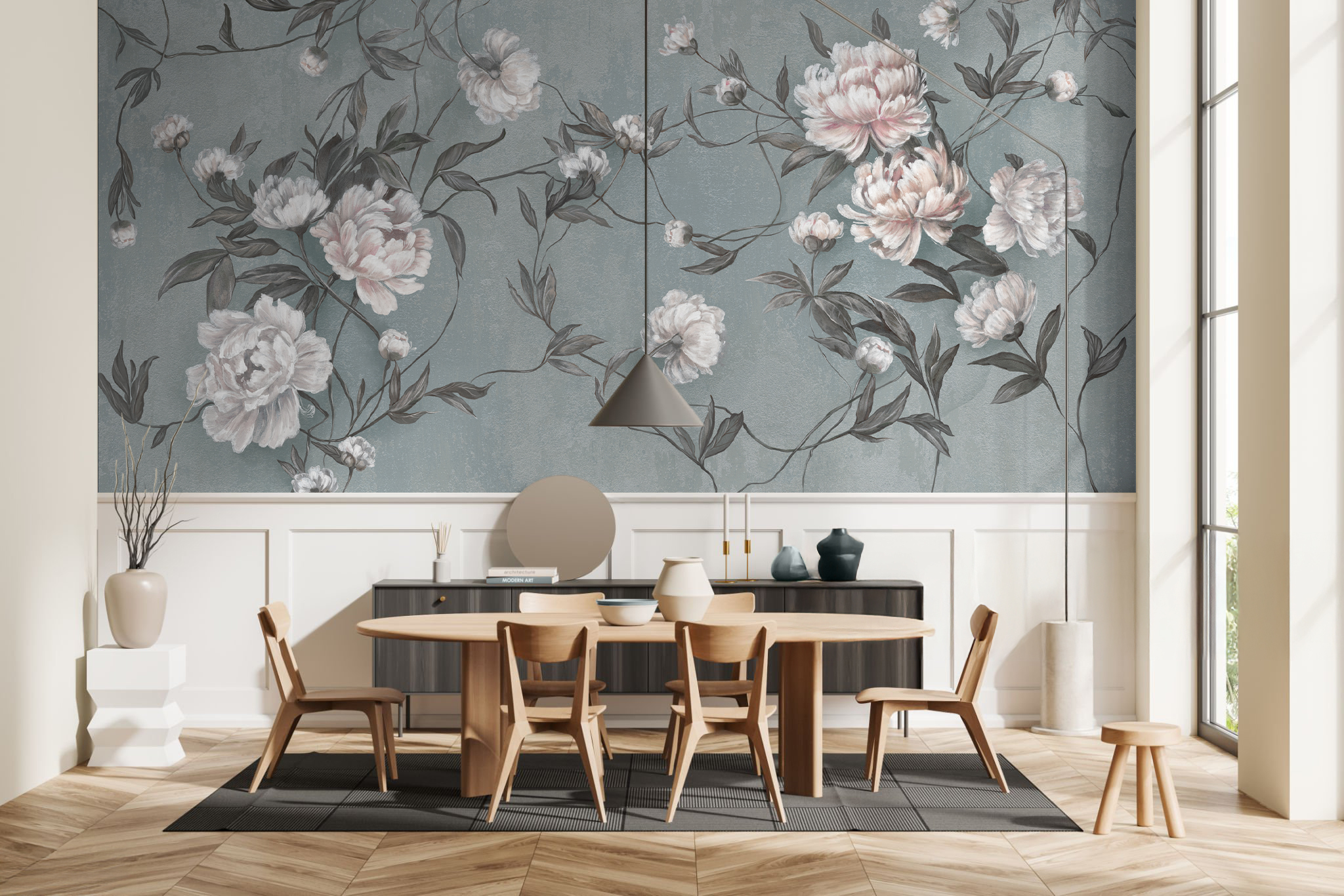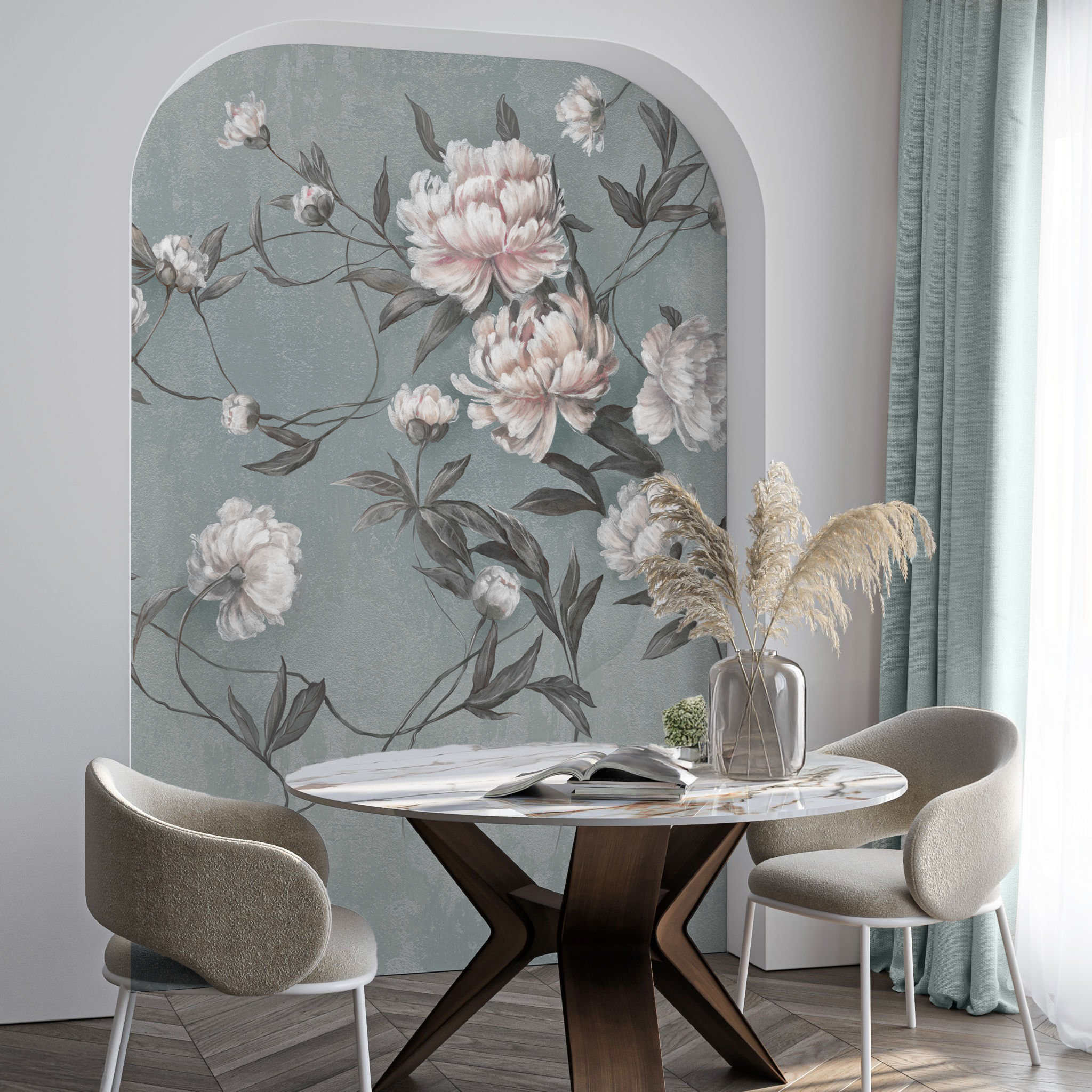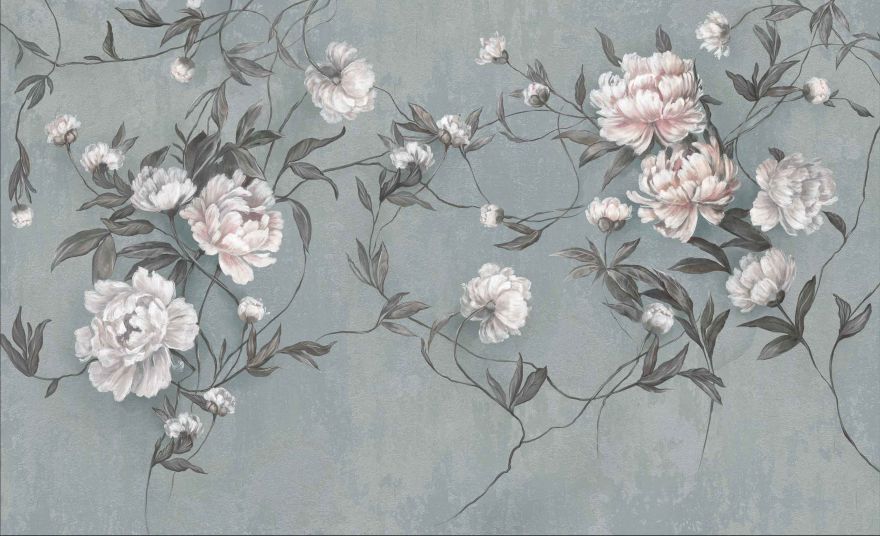 Tapeta Wall and More NIRA 25118 23B to florystyczny wzór z piwoniami i wijącymi się gałązkami, stworzony z myślą o wnętrzach, które mają być spokojne, przytulne i eleganckie jednocześnie. Kompozycja jest delikatna, ale ma wyraźny charakter, dlatego dobrze buduje klimat pomieszczenia bez wrażenia ciężkości. To wzór, który bardziej porządkuje przestrzeń, niż ją dominuje, a przy tym wnosi do niej miękkość i naturalny rytm.